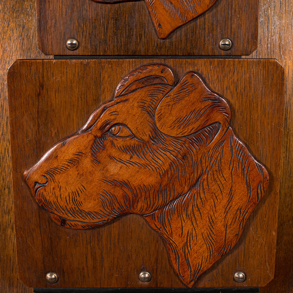 This is an antique decorative dog letter rack. An English, mahogany and oak wall hanging post tidy, dating to the Edwardian period, circa 1910.