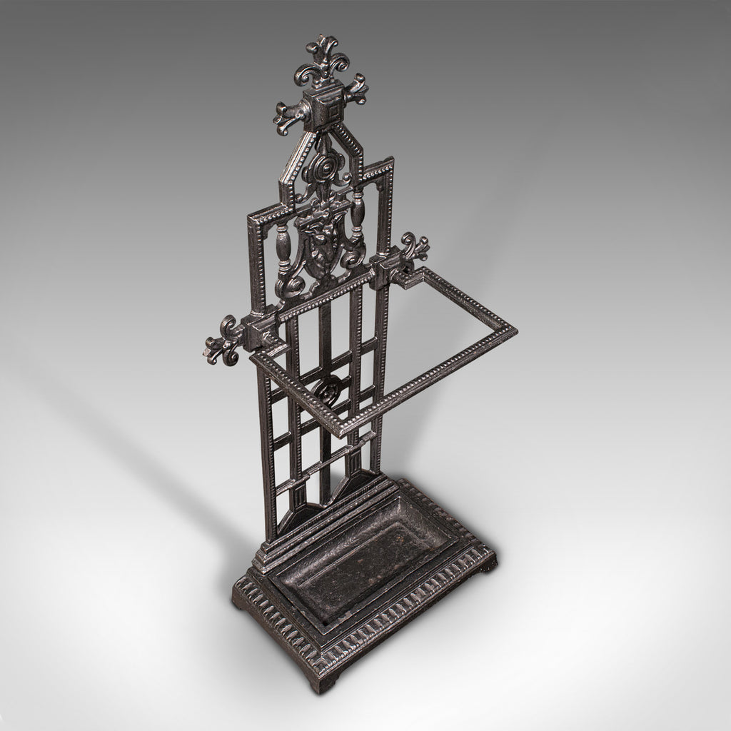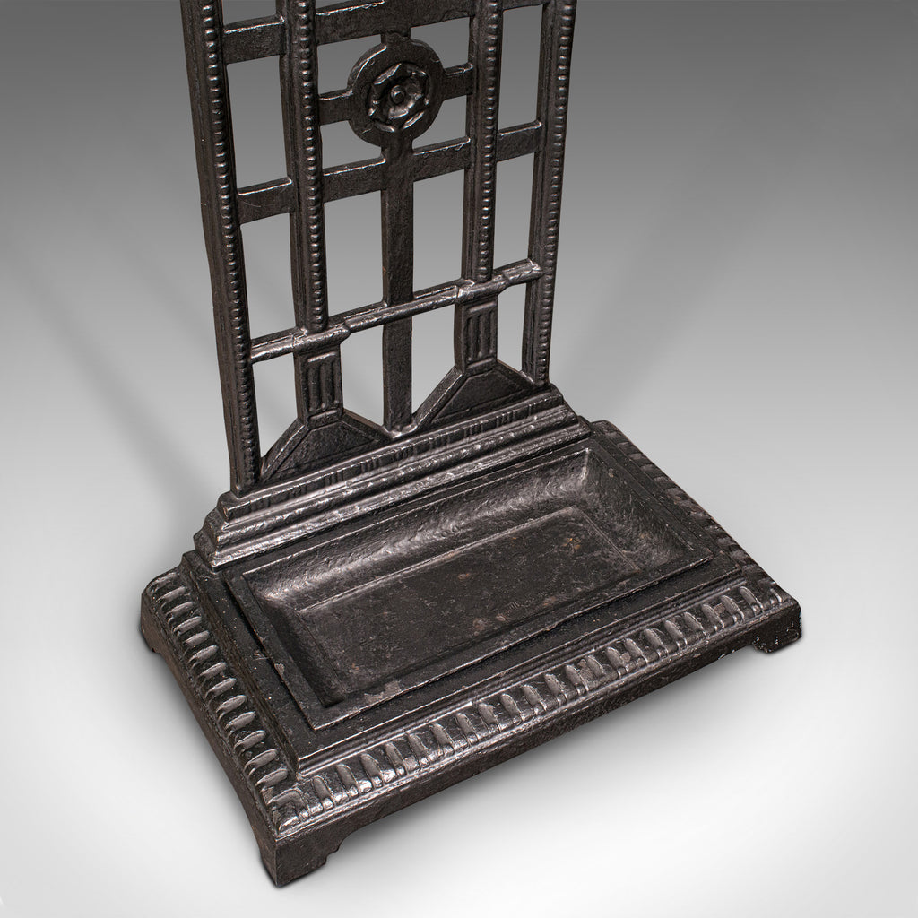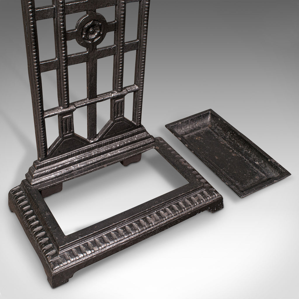 This is an antique decorative stick stand. An English, cast iron hallway umbrella rack, dating to the late Victorian period, circa 1900.