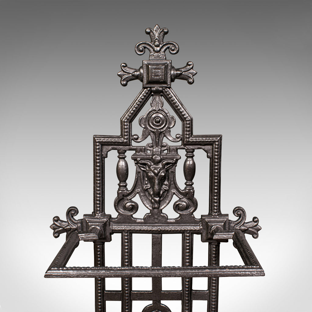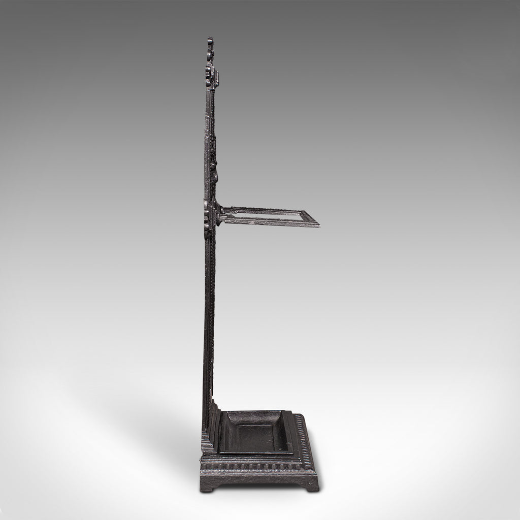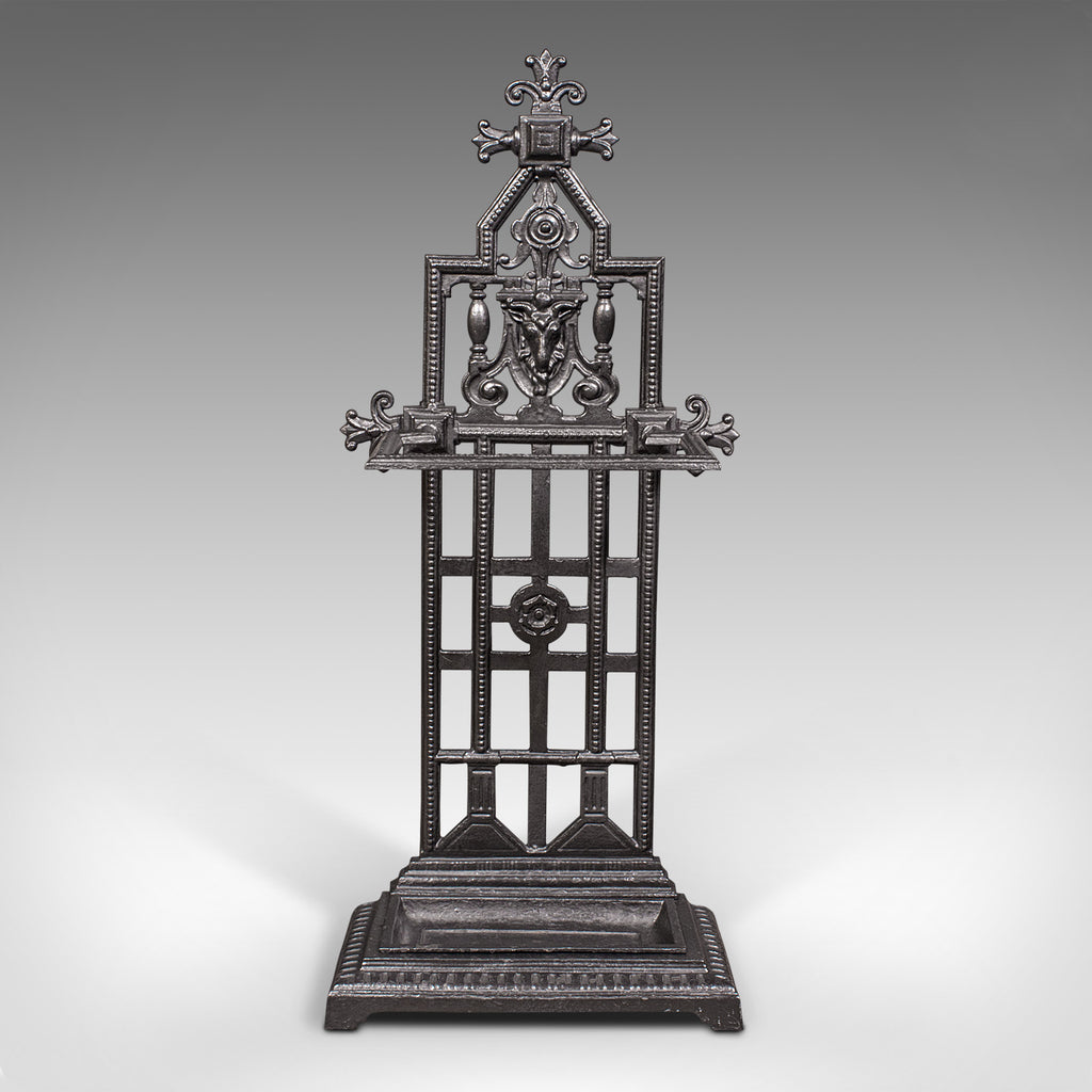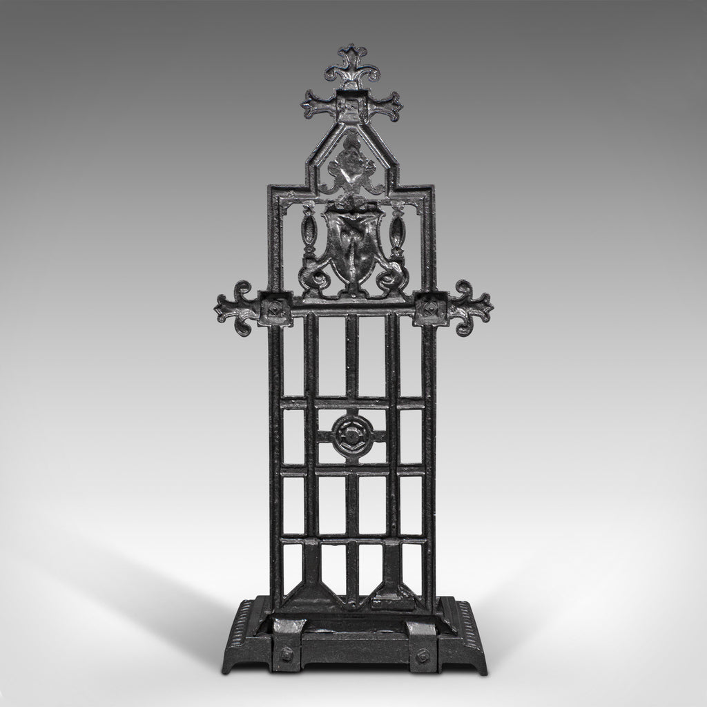 This is an antique decorative stick stand. An English, cast iron hallway umbrella rack, dating to the late Victorian period, circa 1900.