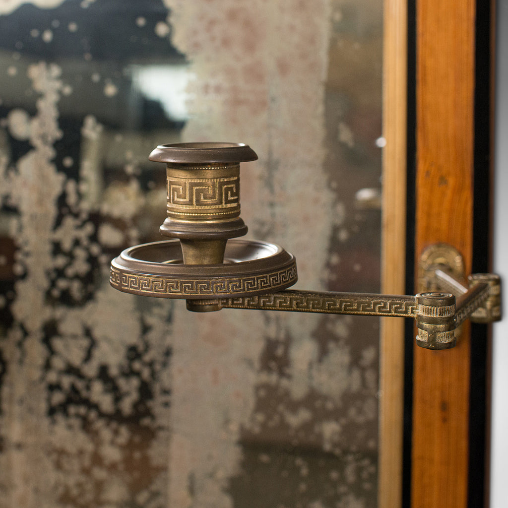 - Adjustable, double fold candle brackets with decorated brass cups bearing a Greek key pattern