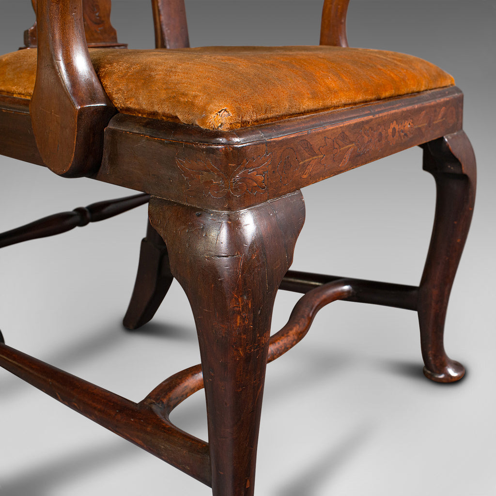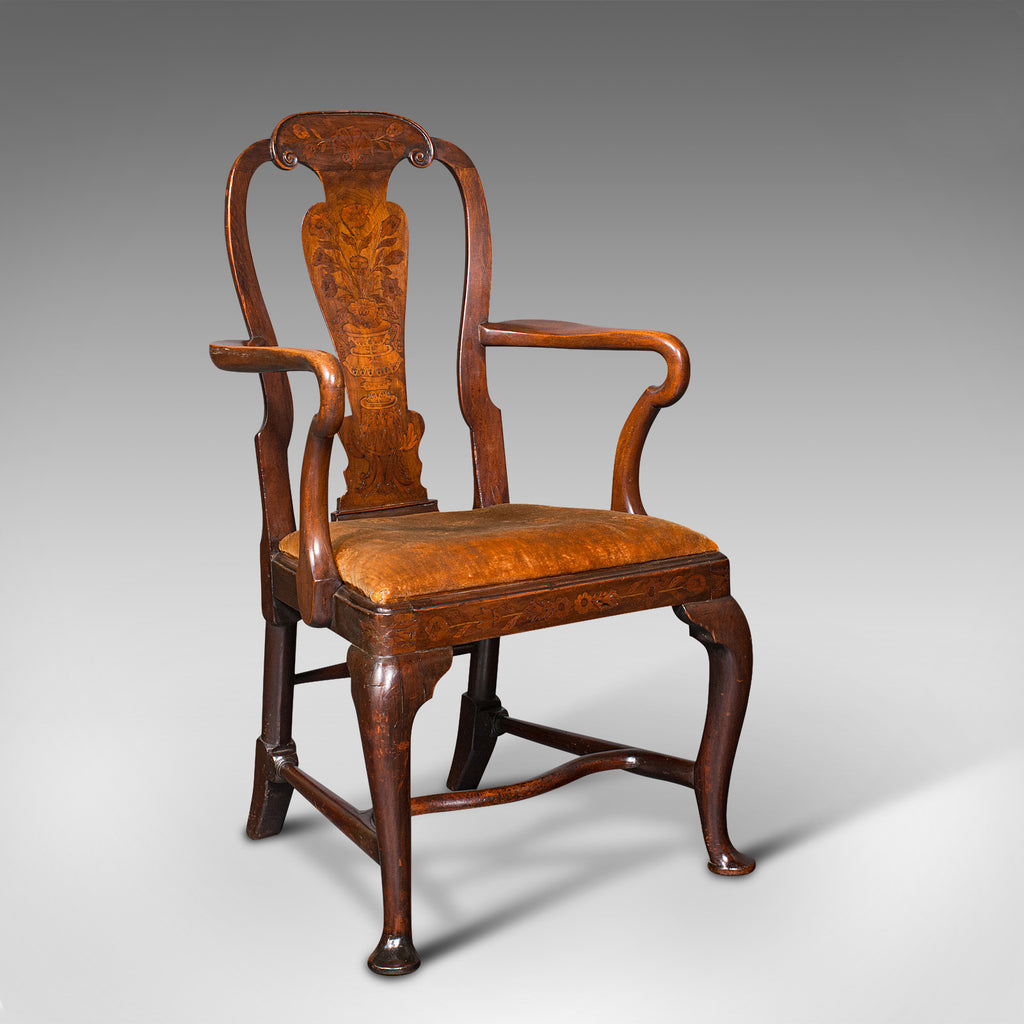 This is an antique marquetry elbow chair. A Dutch, beech and fruitwood carver, dating to the Georgian period, circa 1800.