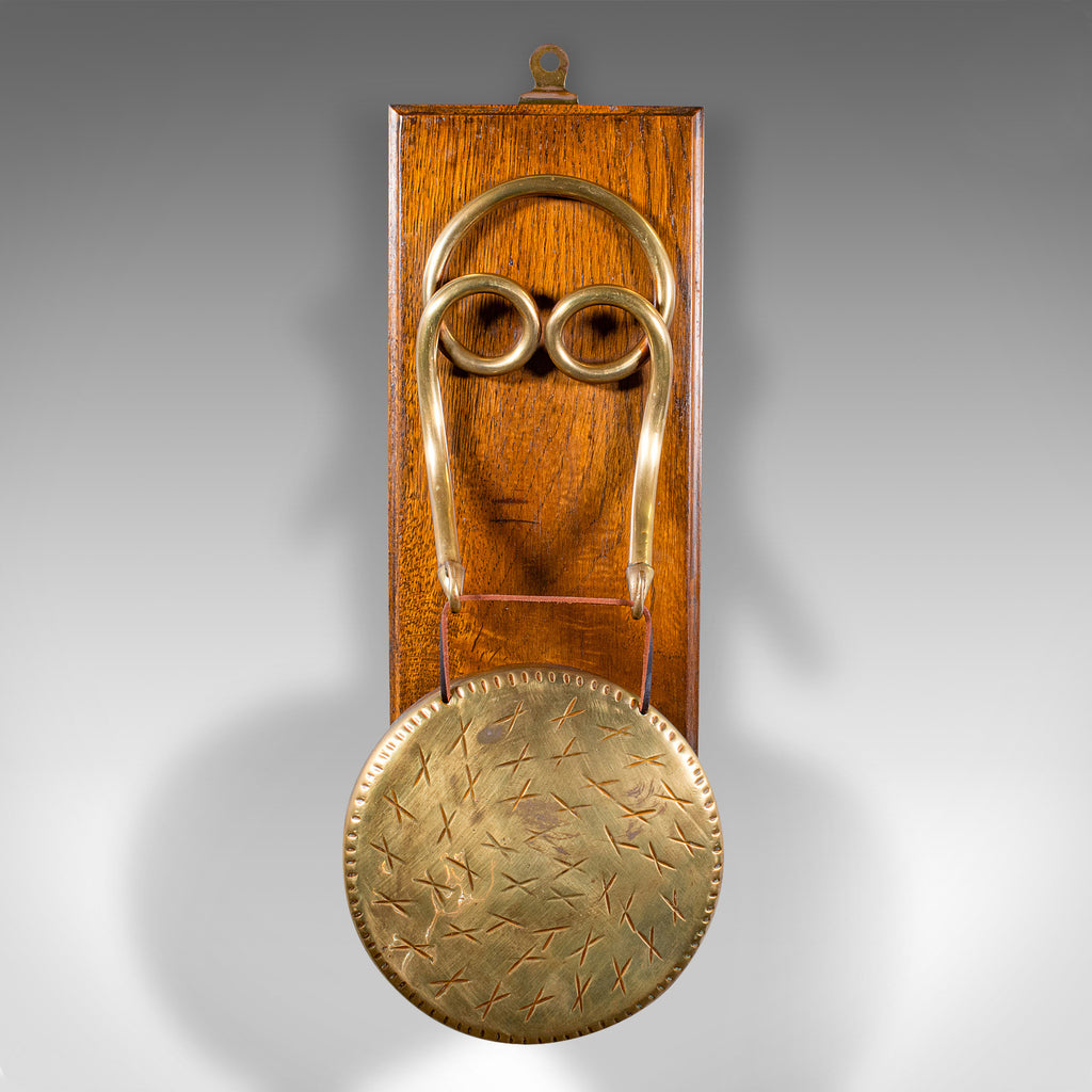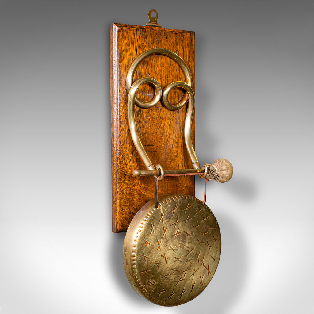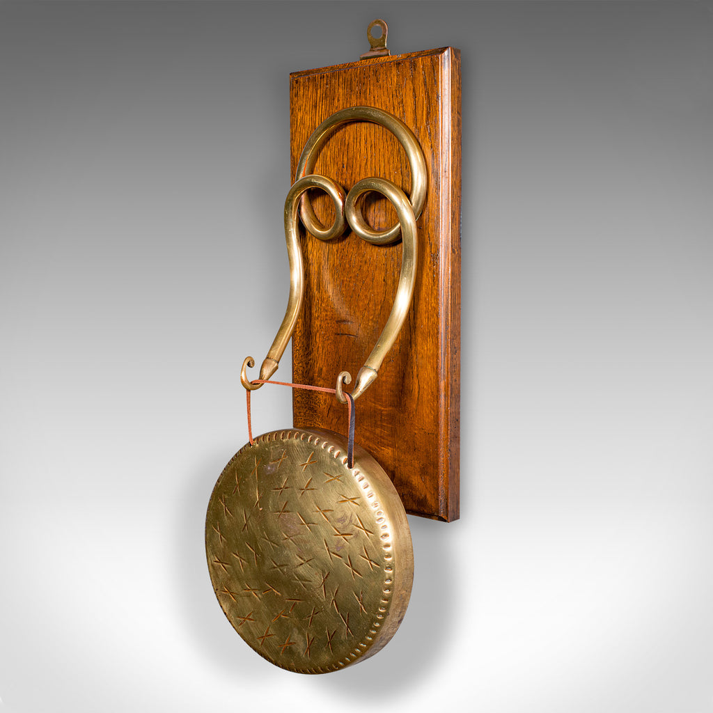Antique Mounted Gong, English, Oak, Brass, Dinner Chime, Edwardian, Circa 1910