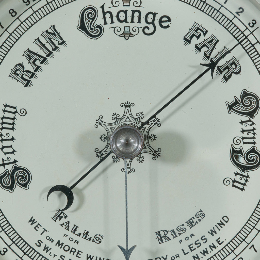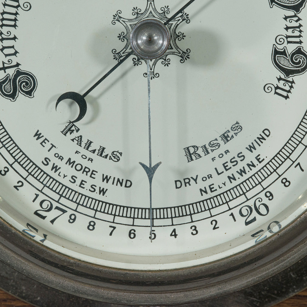 This is an antique ship's bulkhead barometer. An English, silvered brass and oak maritime weather instrument, dating to the late Victorian period, circa 1900.