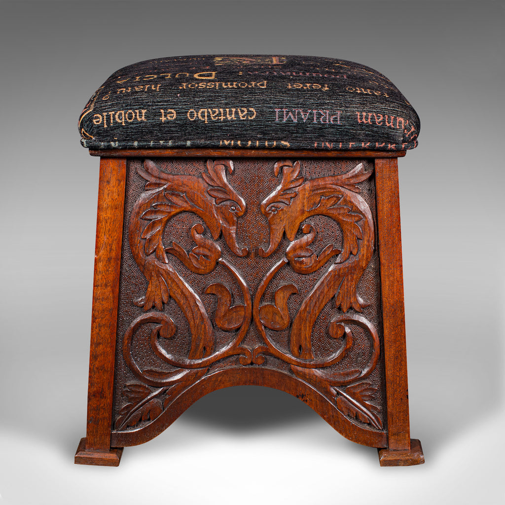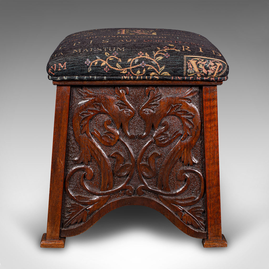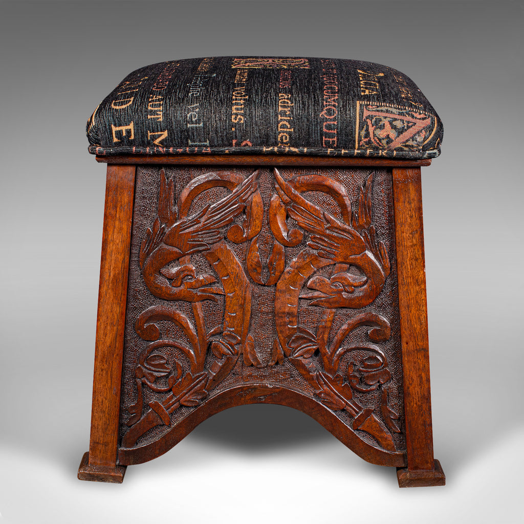This is an antique shoe boy's stool. An English, carved oak and upholstered footstool in Art Nouveau taste, dating to the late Victorian period, circa 1900.