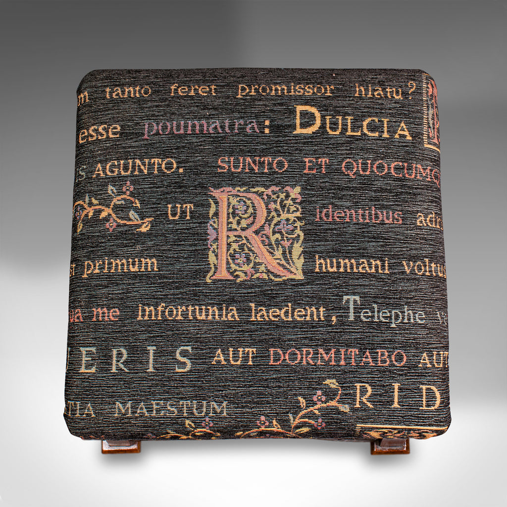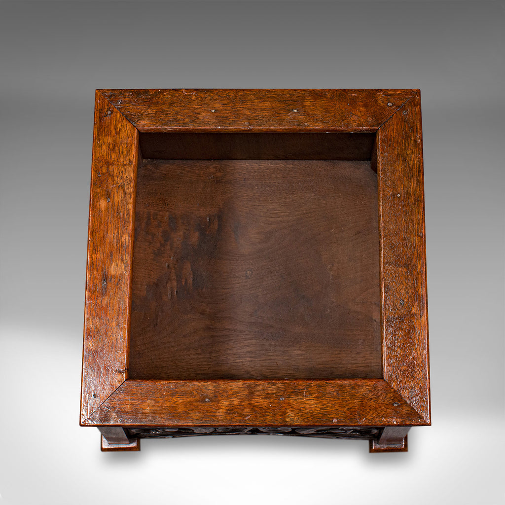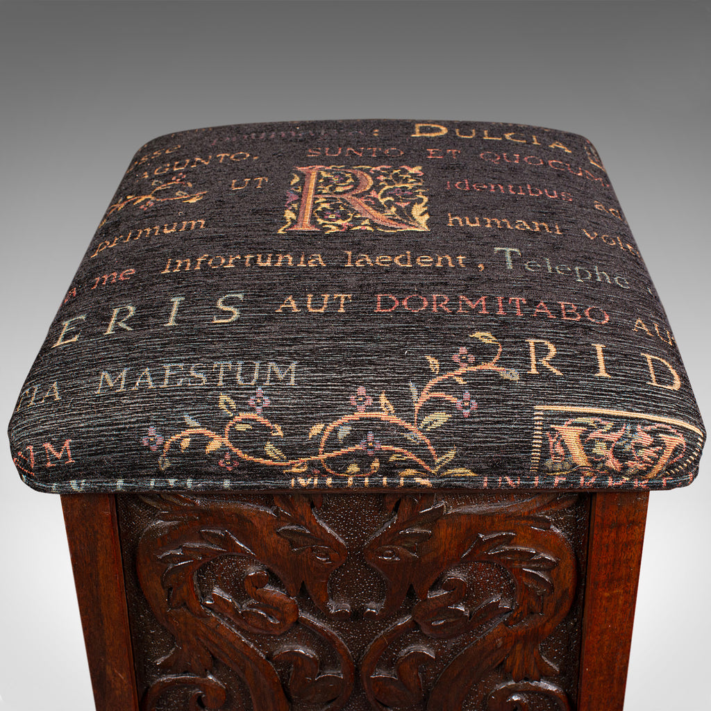 This is an antique shoe boy's stool. An English, carved oak and upholstered footstool in Art Nouveau taste, dating to the late Victorian period, circa 1900.
