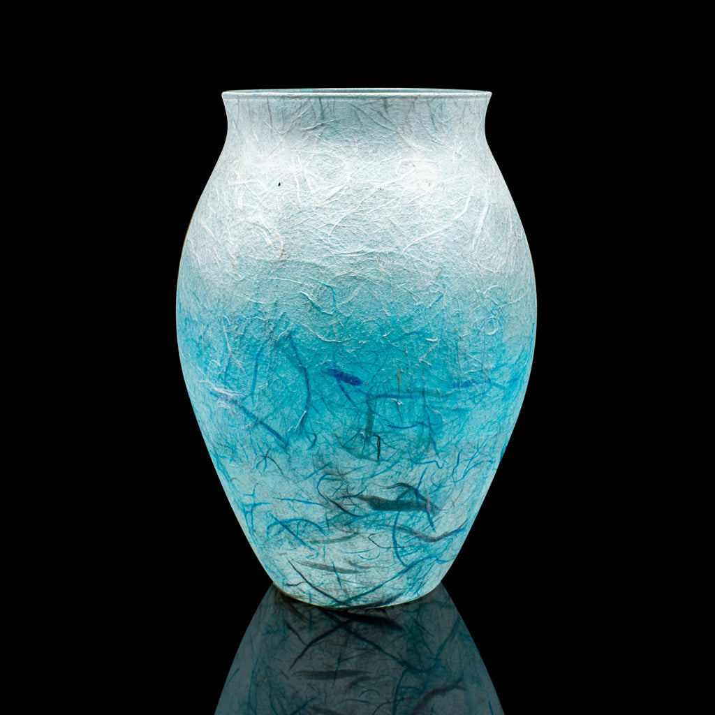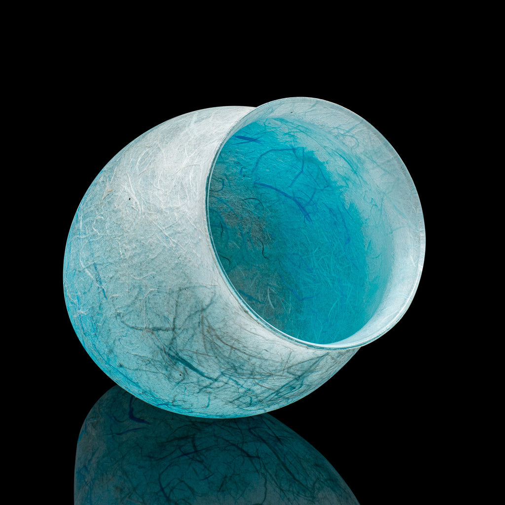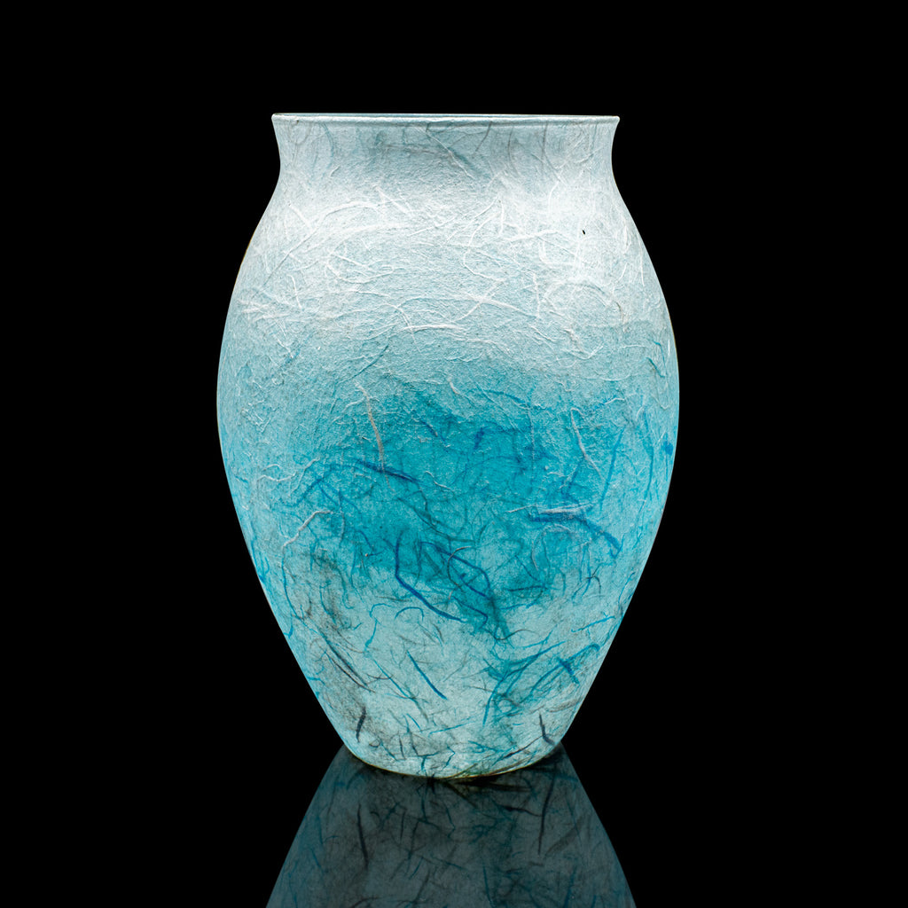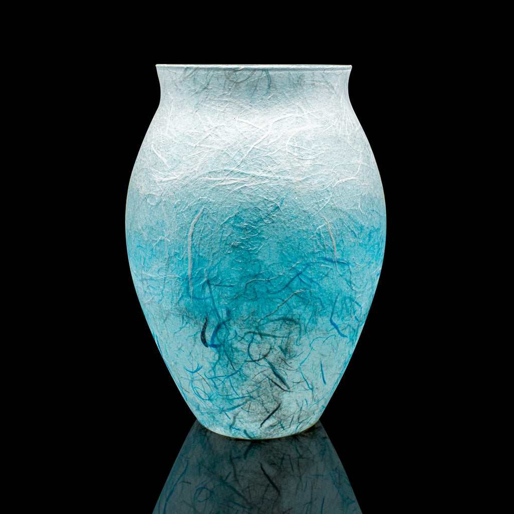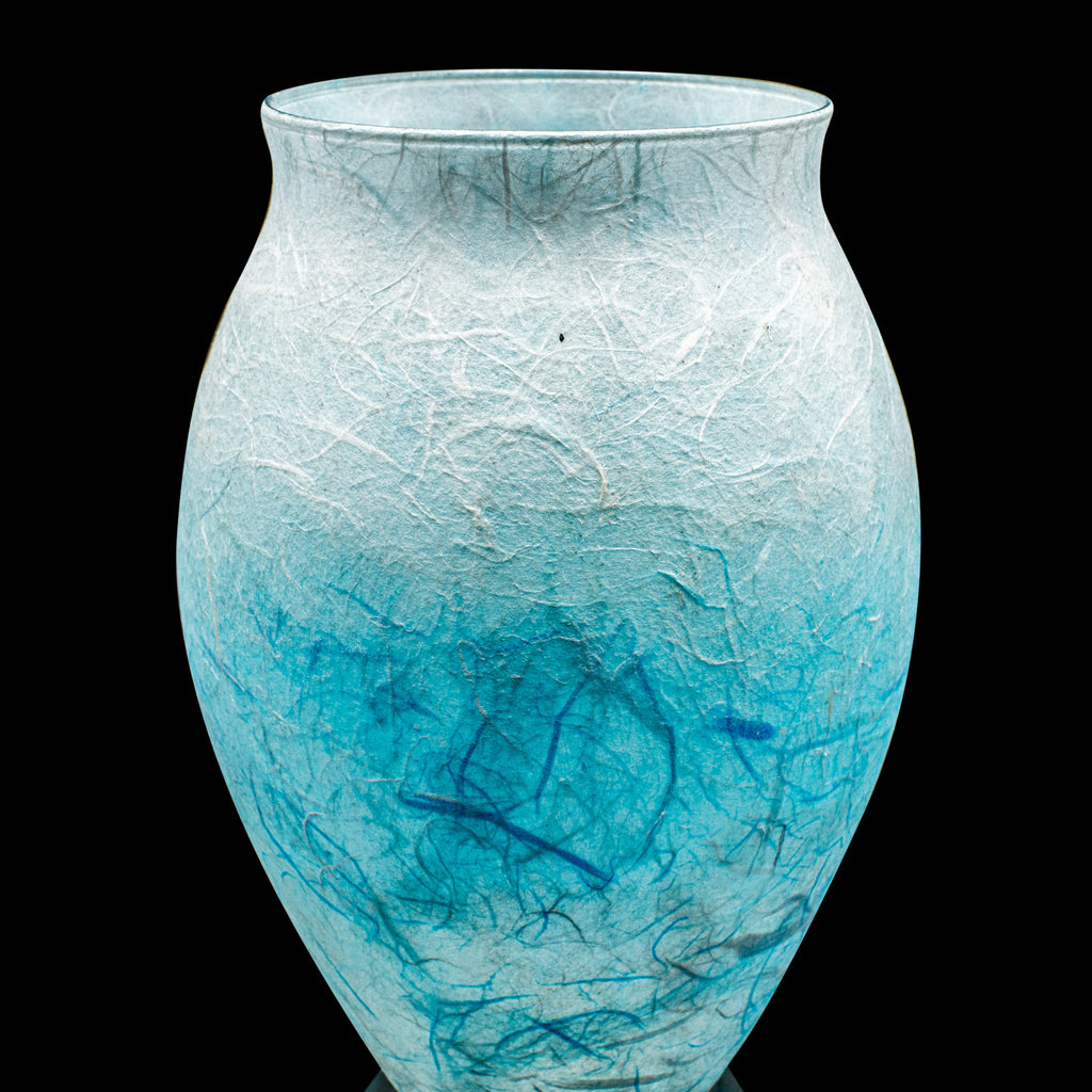 - Silk straw covered glass with a baby blue and light turquoise palette
