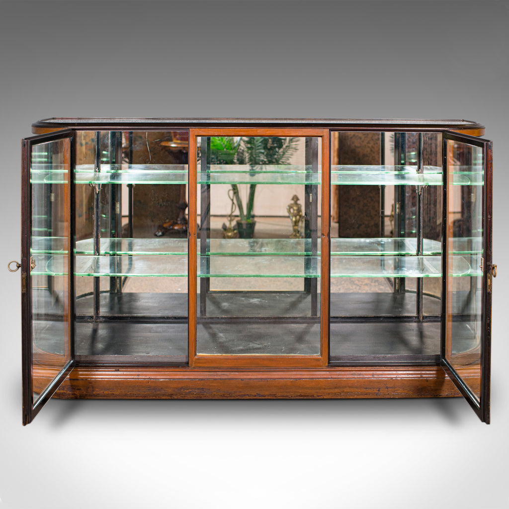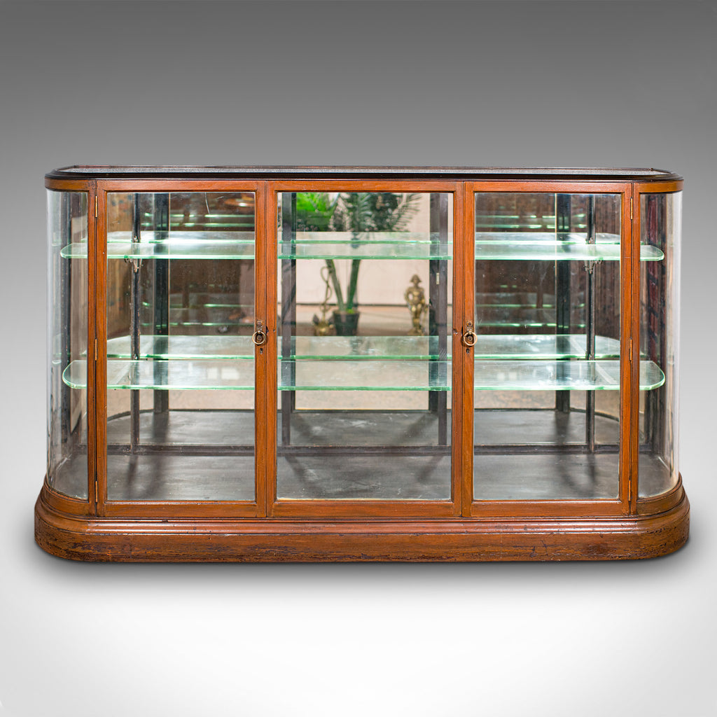 This is a large antique display cabinet. An English, bow end jeweller's shop retail cabinet, dating to the Victorian period, circa 1850.