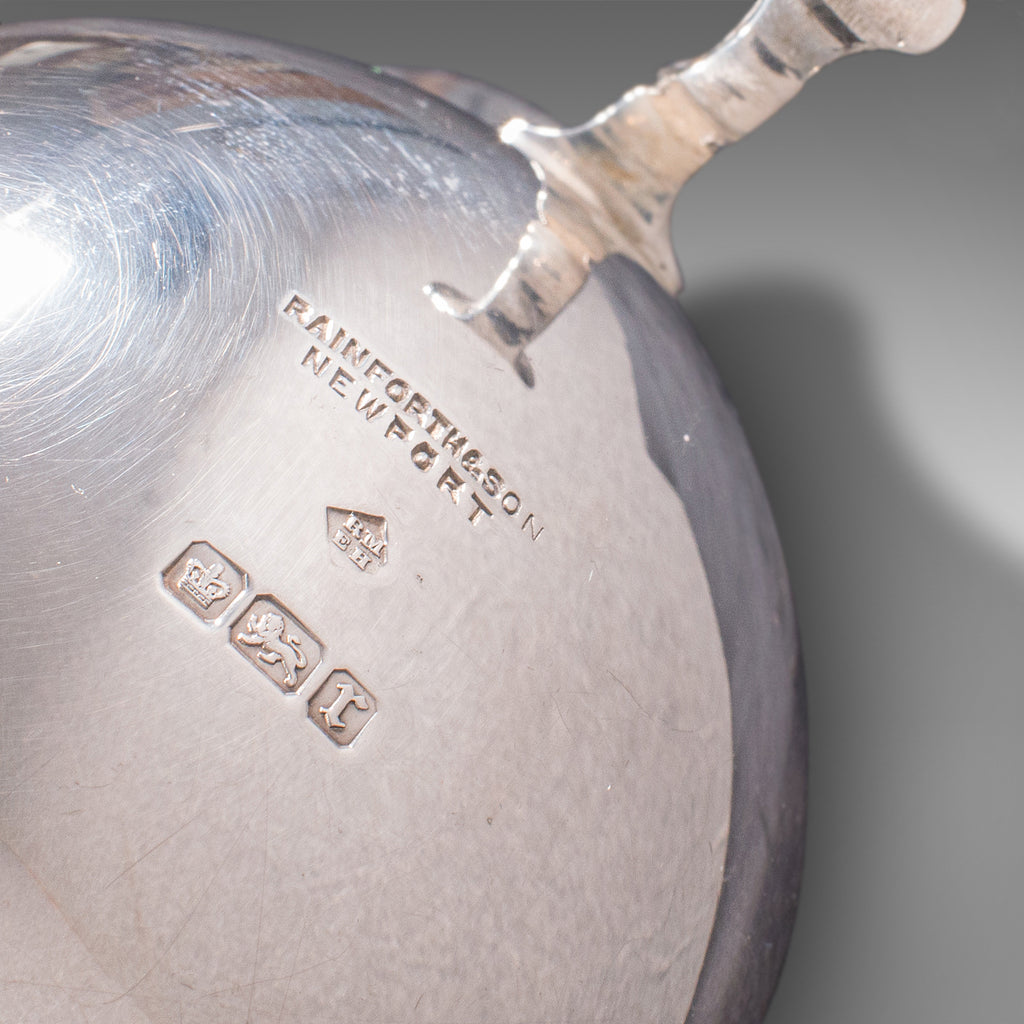This is a pair of antique sauce boats. A British, silver condiment dish with serving spoons, hallmarked during the Edwardian period, 1909.