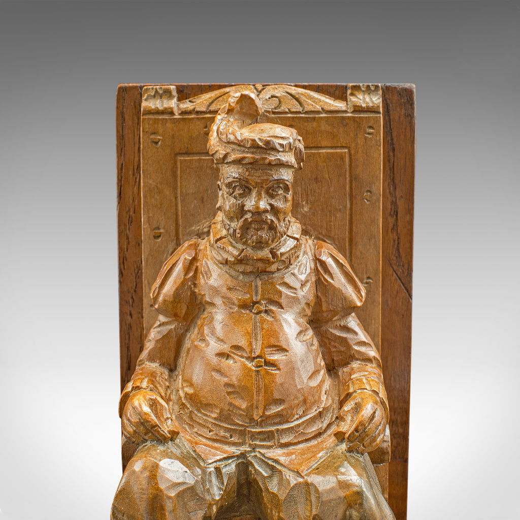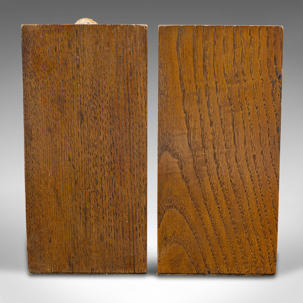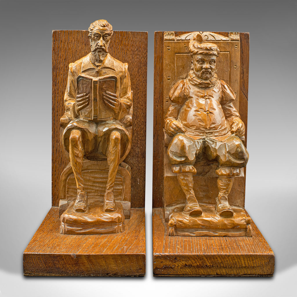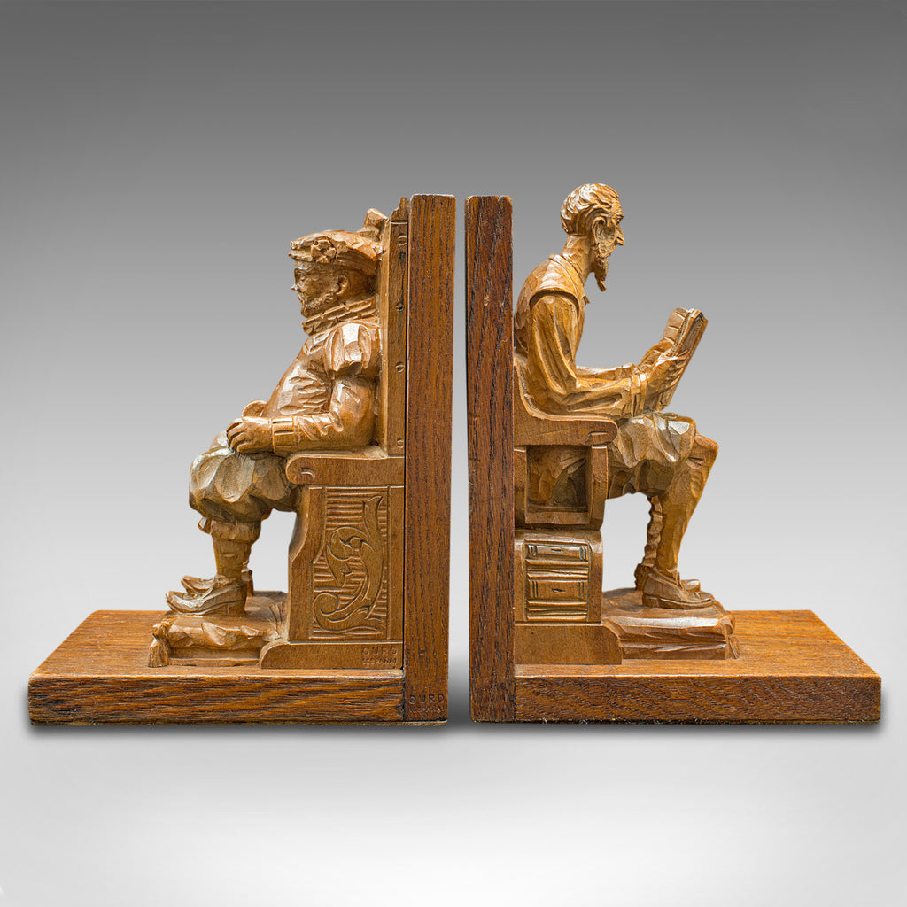 This is a pair of vintage character bookends. A Spanish, hand-carved oak figurative book rest of Don Quixote and Sancho Panza, dating to the mid 20th century, circa 1960.