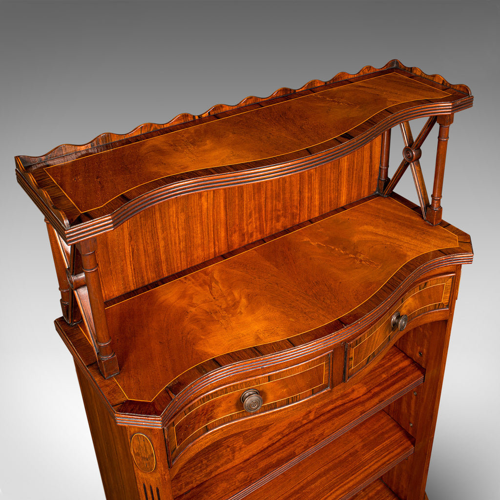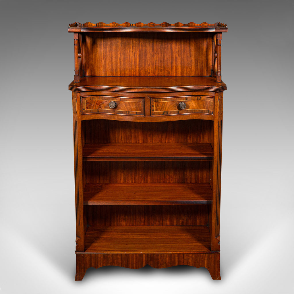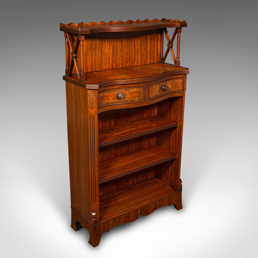 This is a quality vintage Regency revival book cabinet. An English, mahogany open bookcase, dating to the late 20th century, circa 1980.