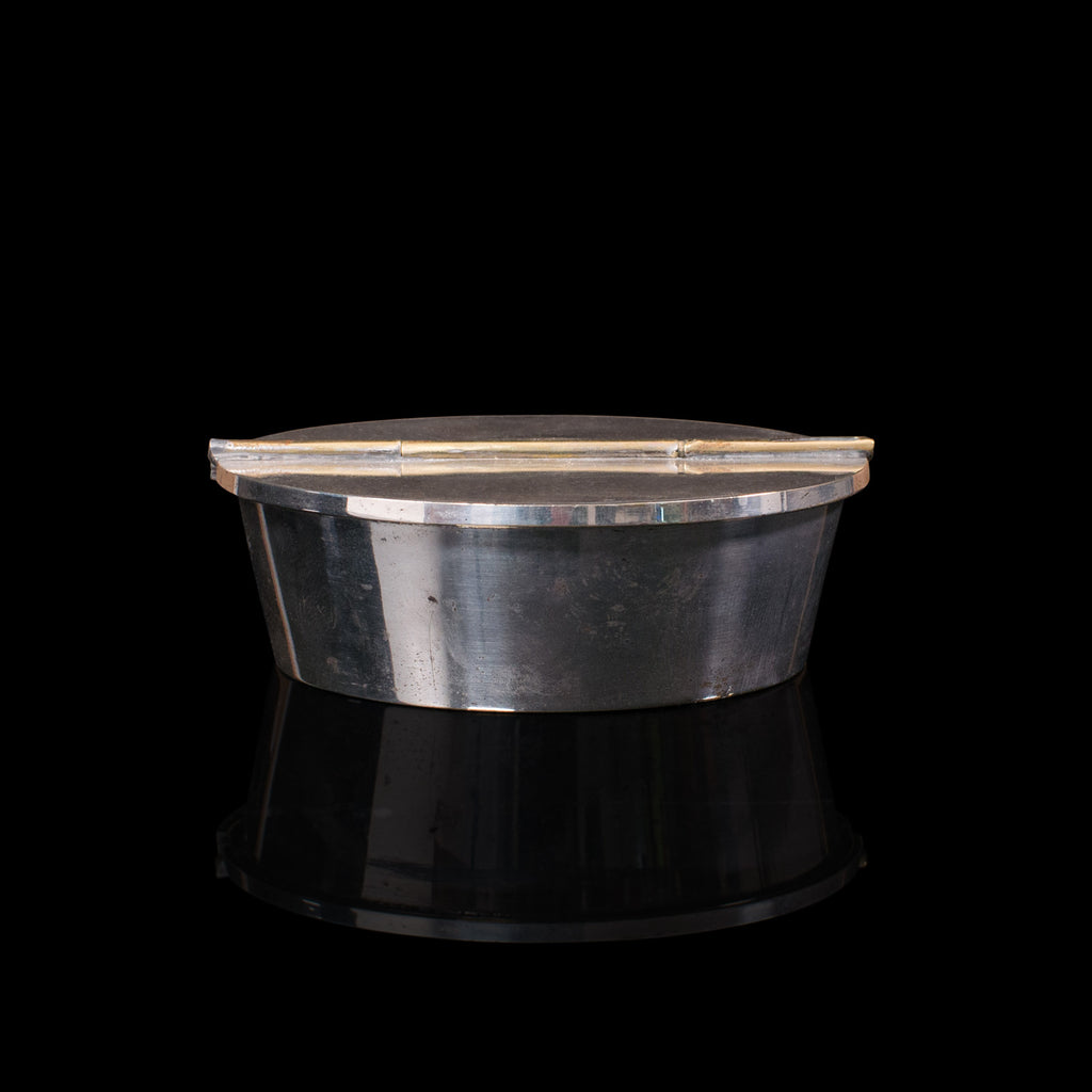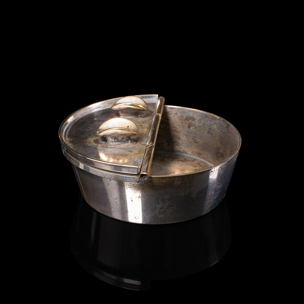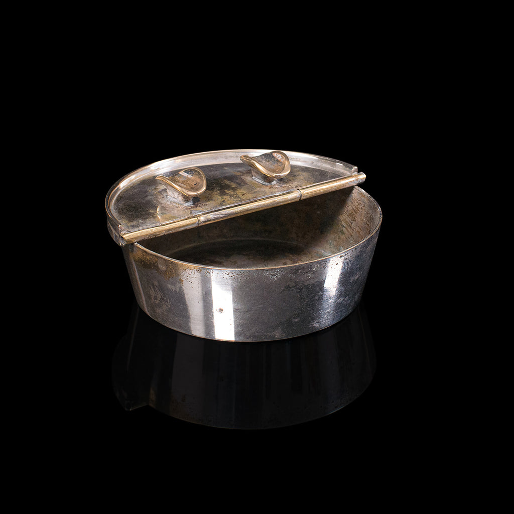 This is a small antique ash tray. An English, cast white metal lidded cigarette rest or cufflink pot, dating to the Edwardian period, circa 1910.