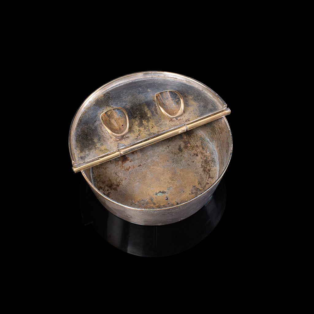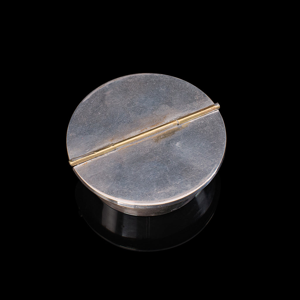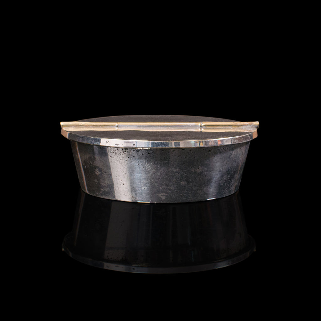 This is a small antique ash tray. An English, cast white metal lidded cigarette rest or cufflink pot, dating to the Edwardian period, circa 1910.