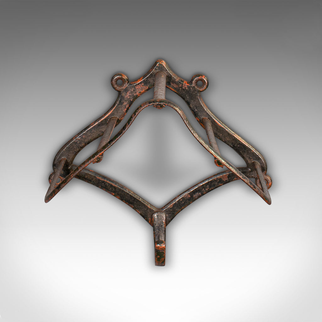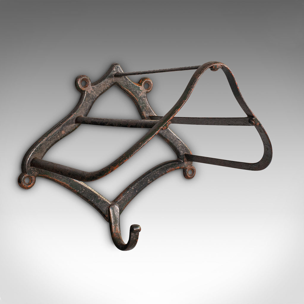 This is a trio of antique equestrian tack racks. An English, wrought iron wall mounted saddle rack, dating to the late Victorian period, circa 1900.