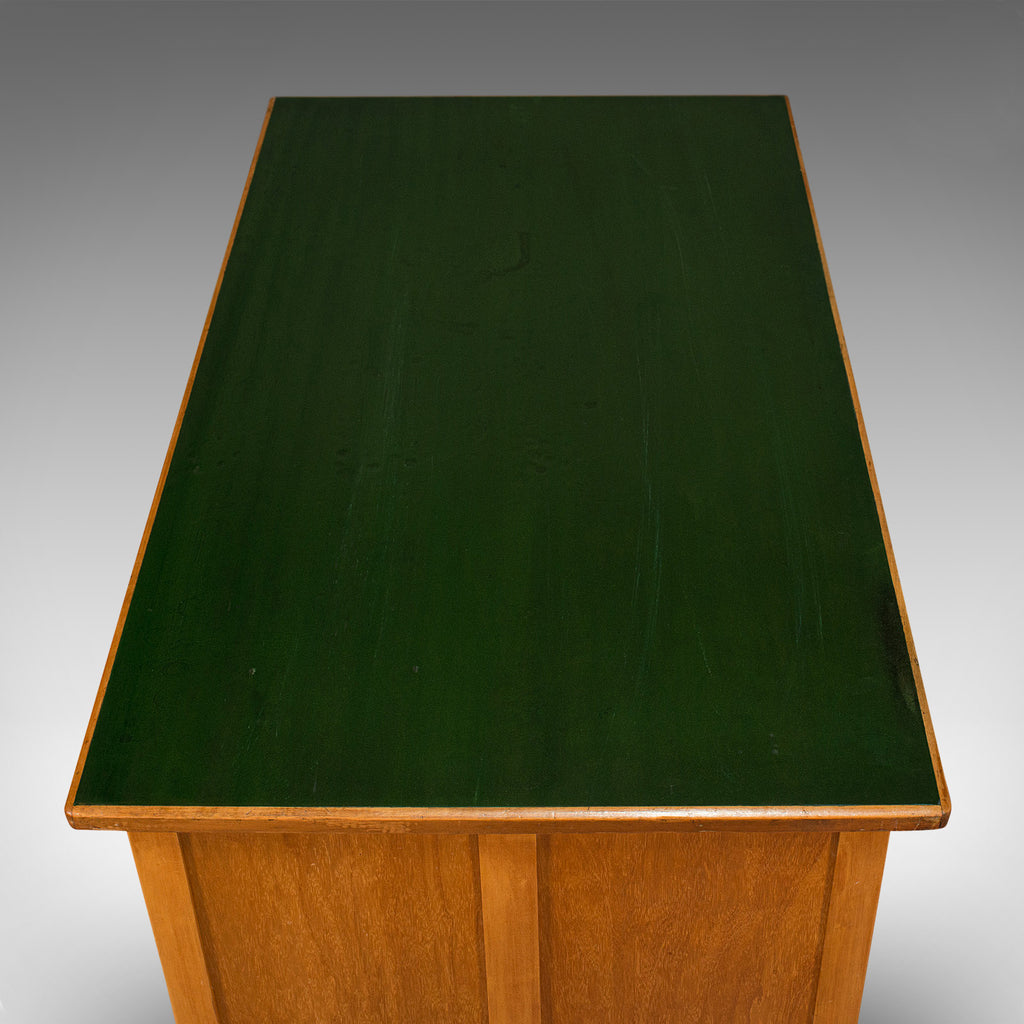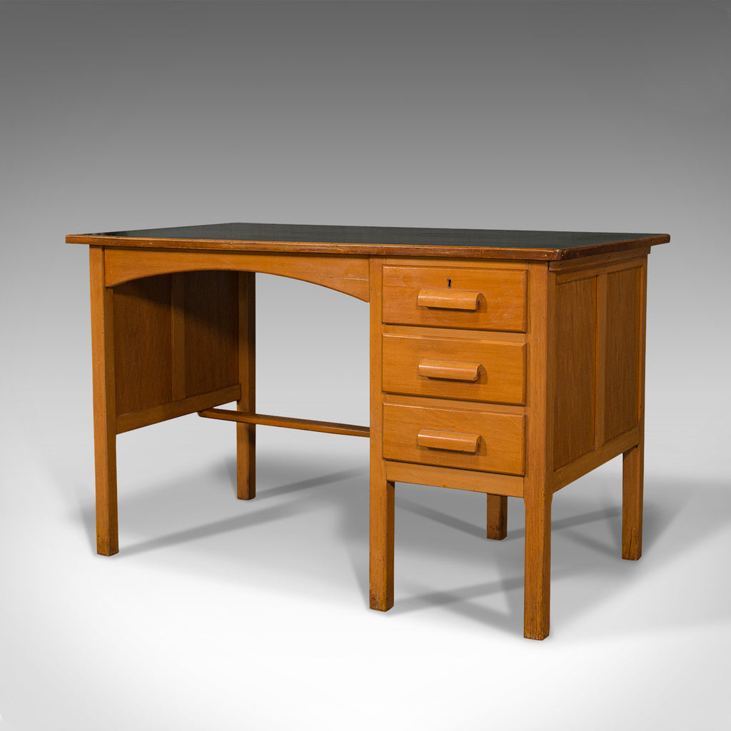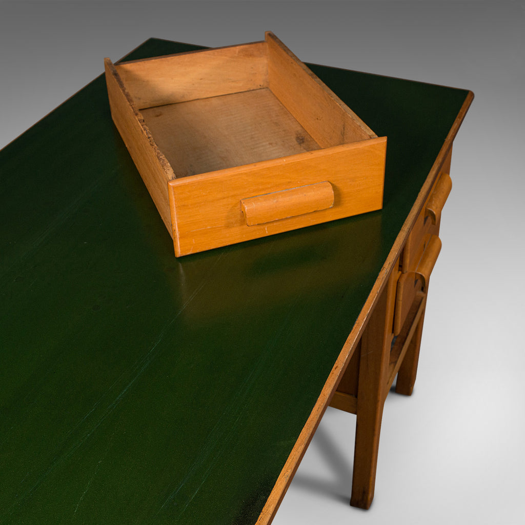 This is a vintage clerk's desk. An English, light oak writing or study table, dating to the mid 20th century, circa 1960.