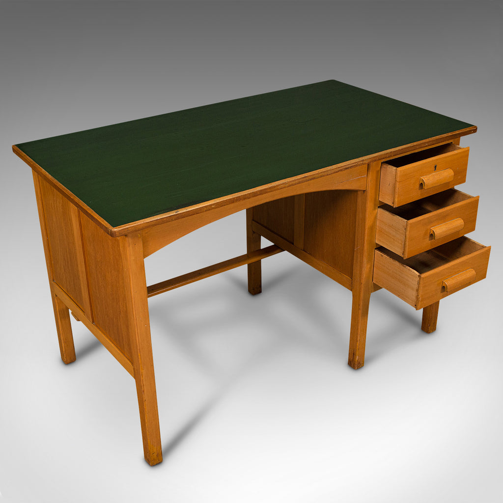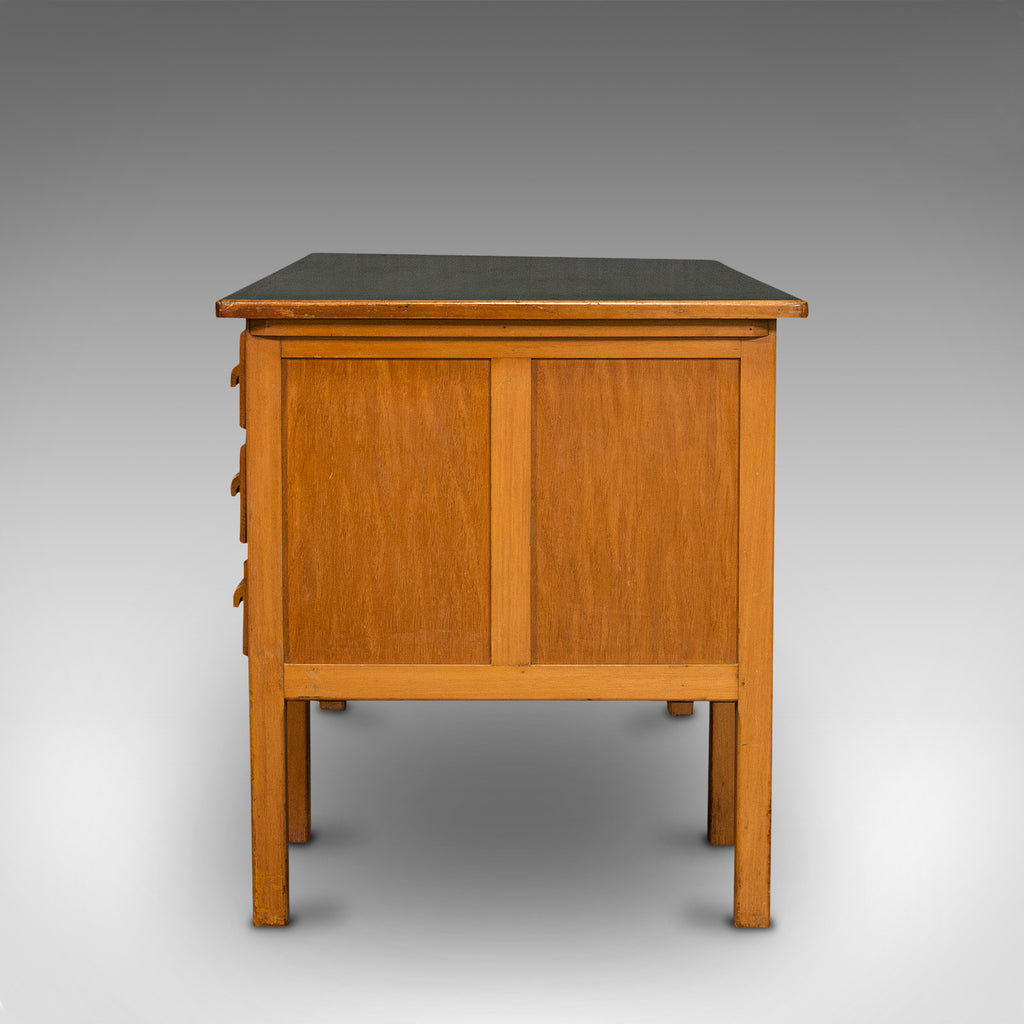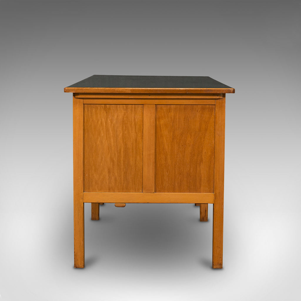 This is a vintage clerk's desk. An English, light oak writing or study table, dating to the mid 20th century, circa 1960.