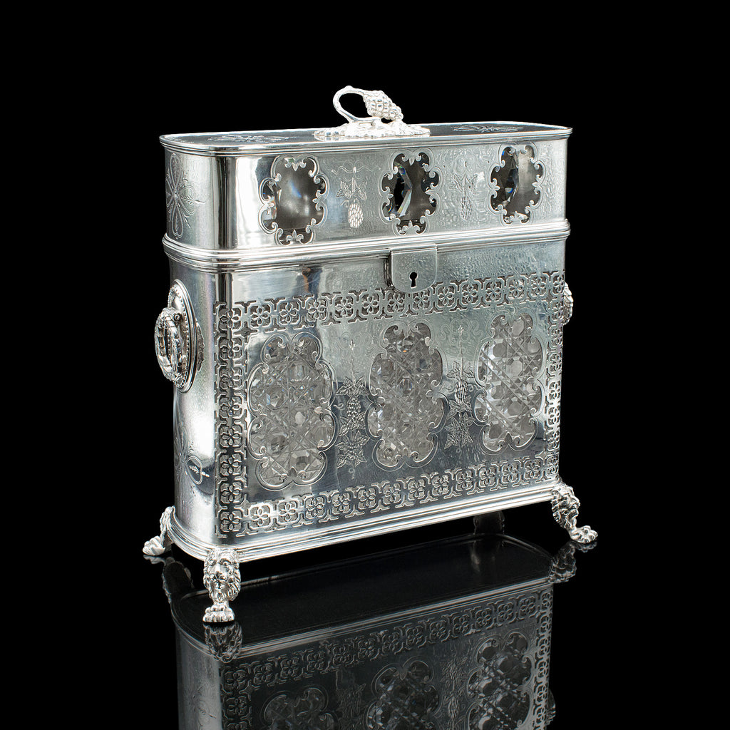 This is an antique tantalus. An English, silver plated three decanter set dating to the Edwardian period, circa 1910. A fascinating example with a refined decorative presence and attractive later glassware.