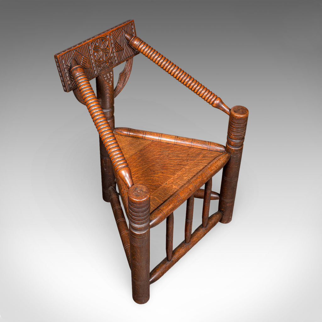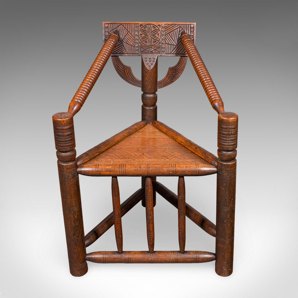 This is an antique turner’s chair. An English, oak John Starkey 'Warwick' style elbow seat, dating to the late Victorian period, circa 1900. A charming and distinctive example inspired by the celebrated ‘Old Saxon’ form, offering great presence and excellent craftsmanship.