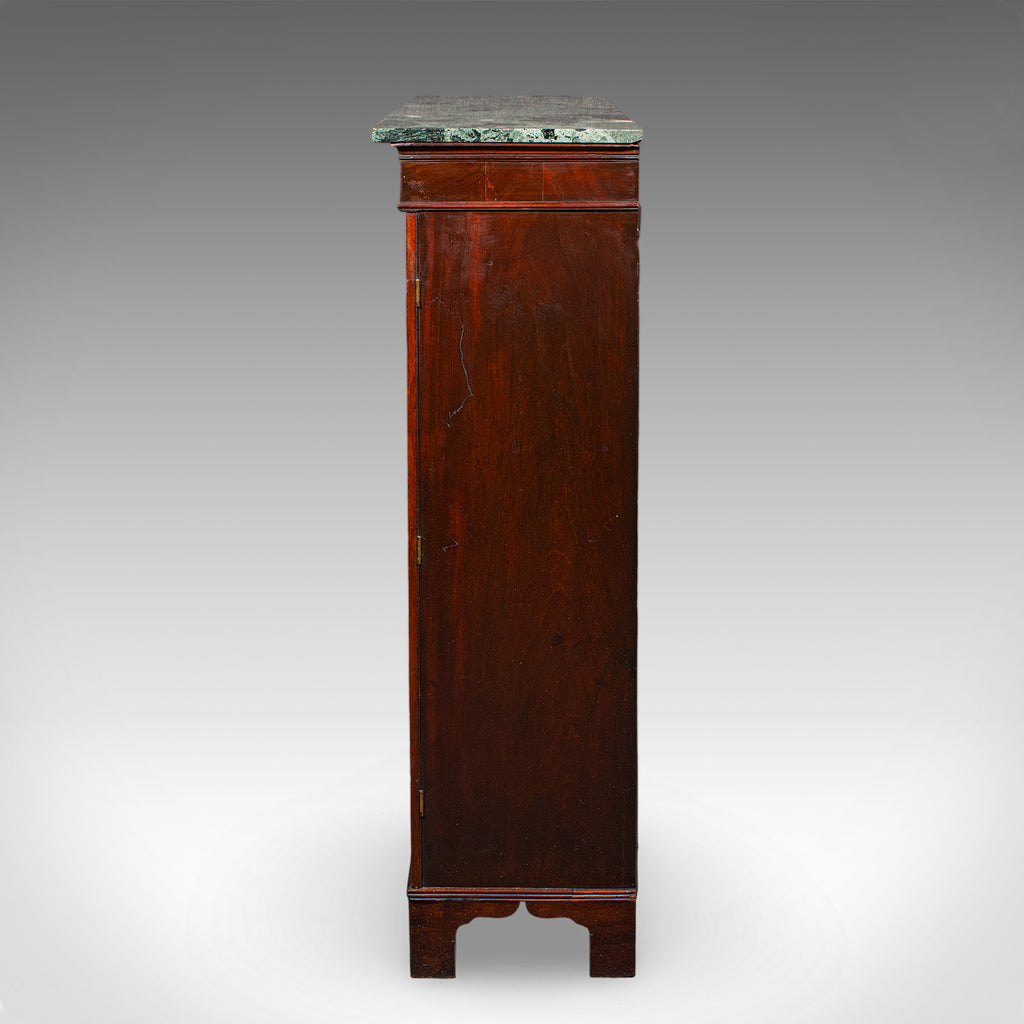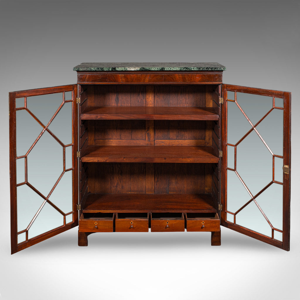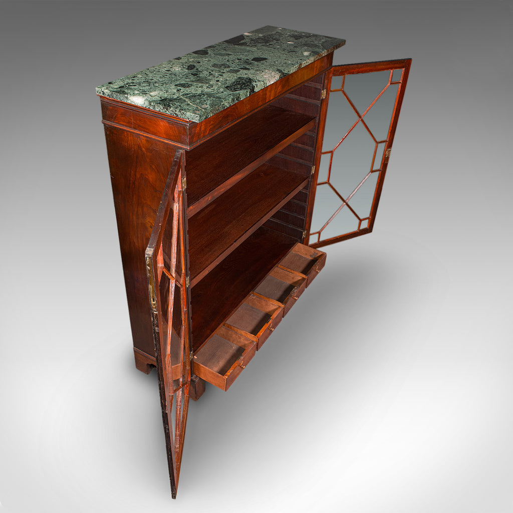 This is an antique astragal glazed bookcase. An English, mahogany and marble display book cabinet, dating to the late Victorian period, circa 1880.