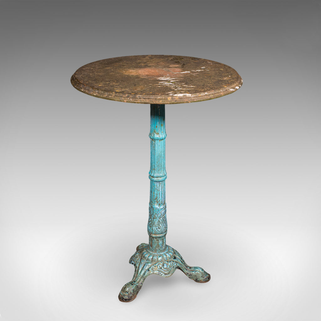 This is an antique conservatory table. An English, Alabaster marble and cast iron portico or veranda tea table, dating to the Regency period, circa 1820.