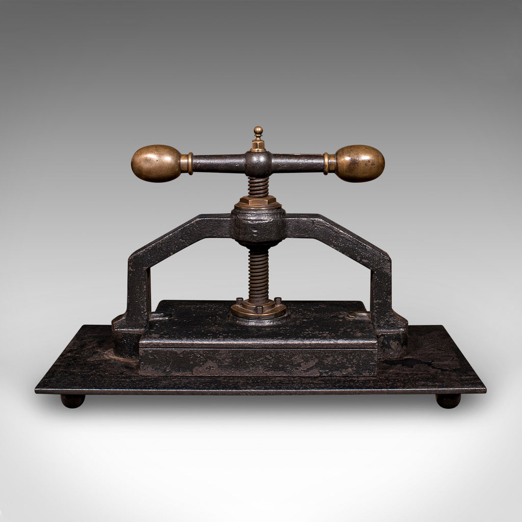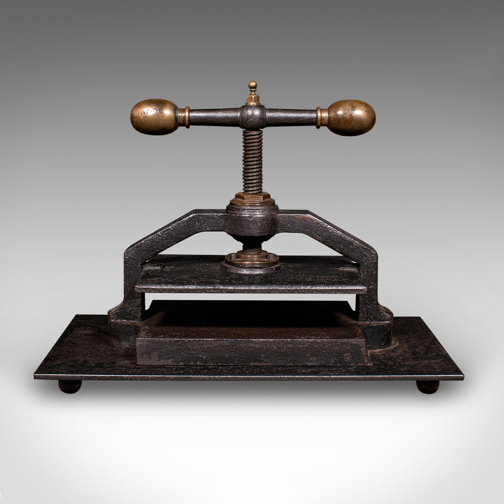 This is a superb antique book press. An English, cast iron industrial binder or flower press dating to the Georgian period, circa 1800. Delightfully robust and tactile, this piece demonstrates the engineering quality and refined design typical of early industrial Britain. Equally functional and decorative, it serves perfectly in a bookbinding workshop, artist’s studio, or collector’s display.