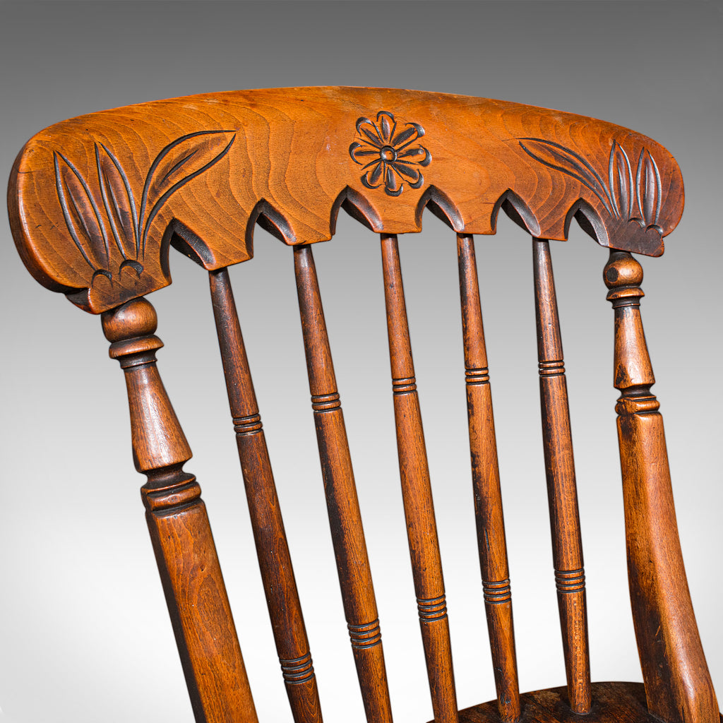 - Five turned spindles form the gently angled back rest, supported by a pair of canted side posts