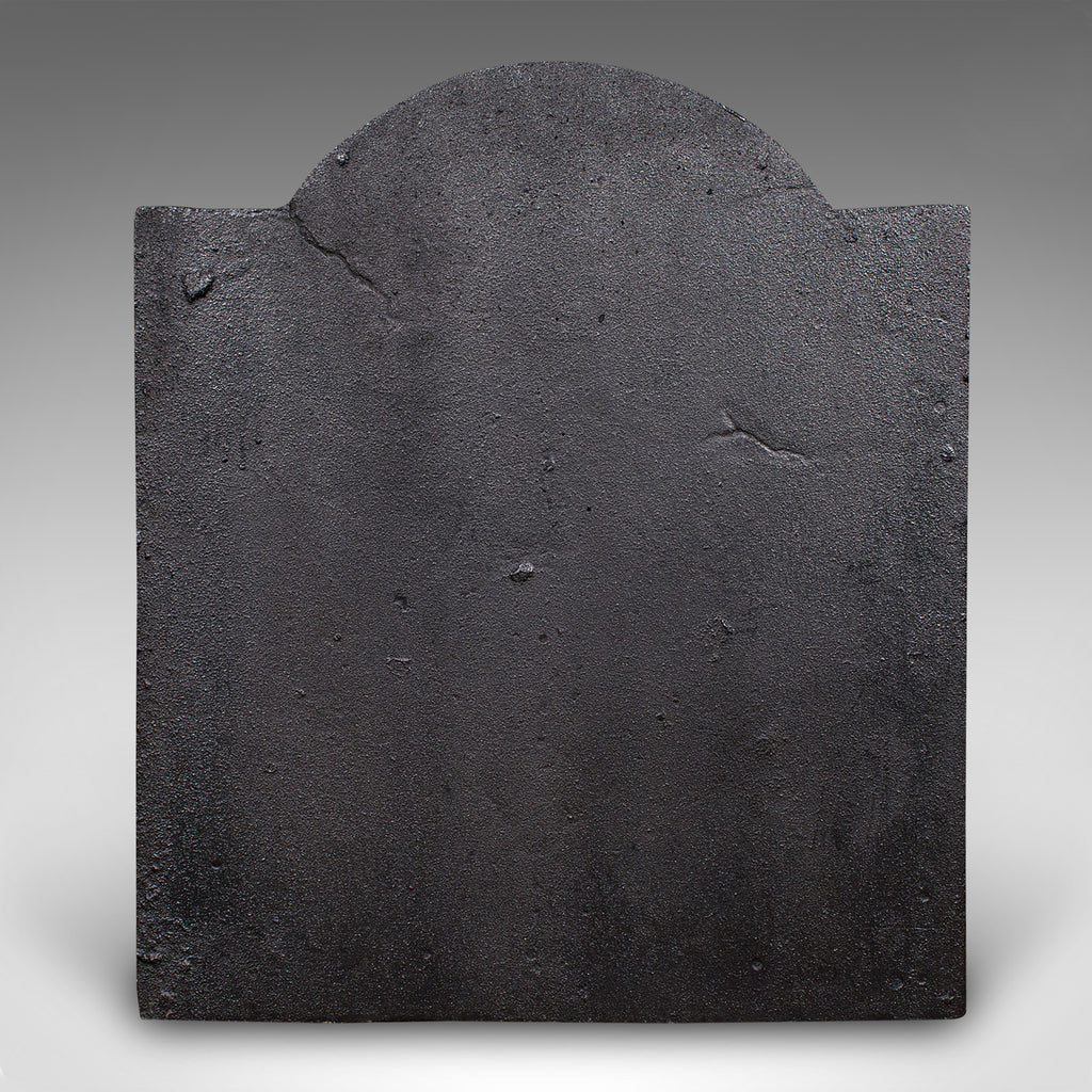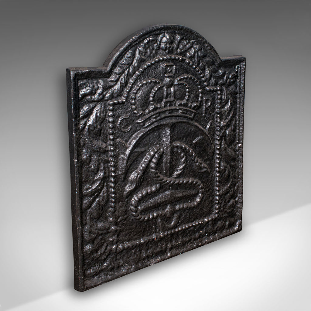This is an antique maritime fire back, an English cast iron fireplace reflector in Carolean taste, dating to the early Victorian period, circa 1850. An attractive fireside piece with strong nautical and historical appeal.