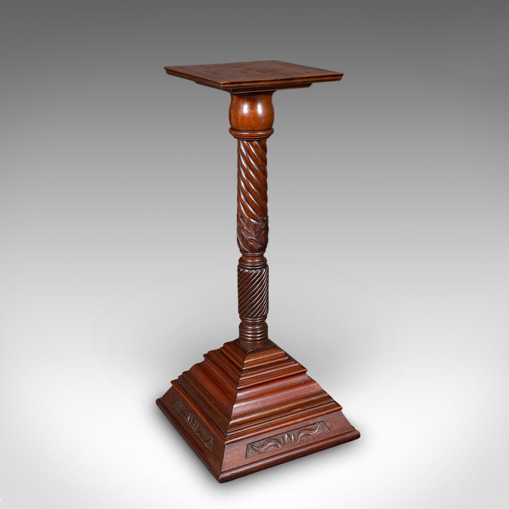 This is a pair of large antique torchiere. An English, mahogany country house bust stand or jardiniere pedestal, dating to the late Victorian period, circa 1900. Excellent display furniture with impressive stature and the refined presence suited to a hotel, gallery or grand entrance hall.