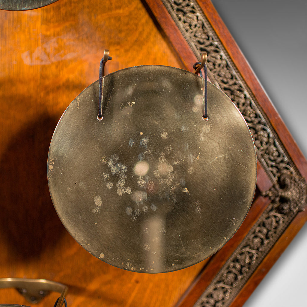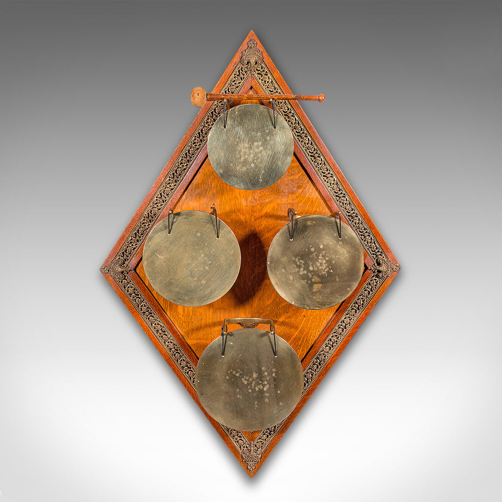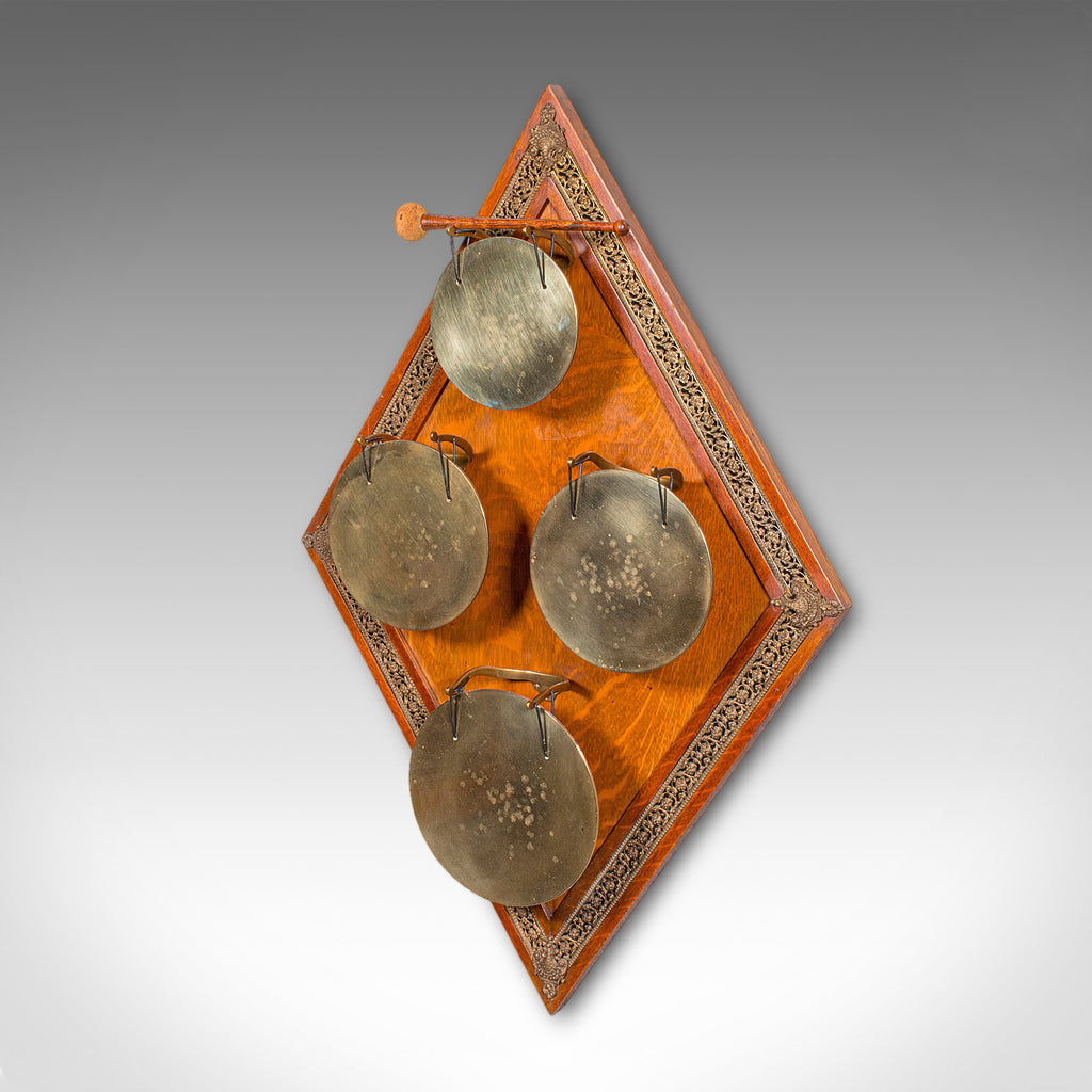 This is an antique four-strike palazzo wall chime. An Italian, brass and oak dinner gong, dating to the late Victorian period, circa 1900.