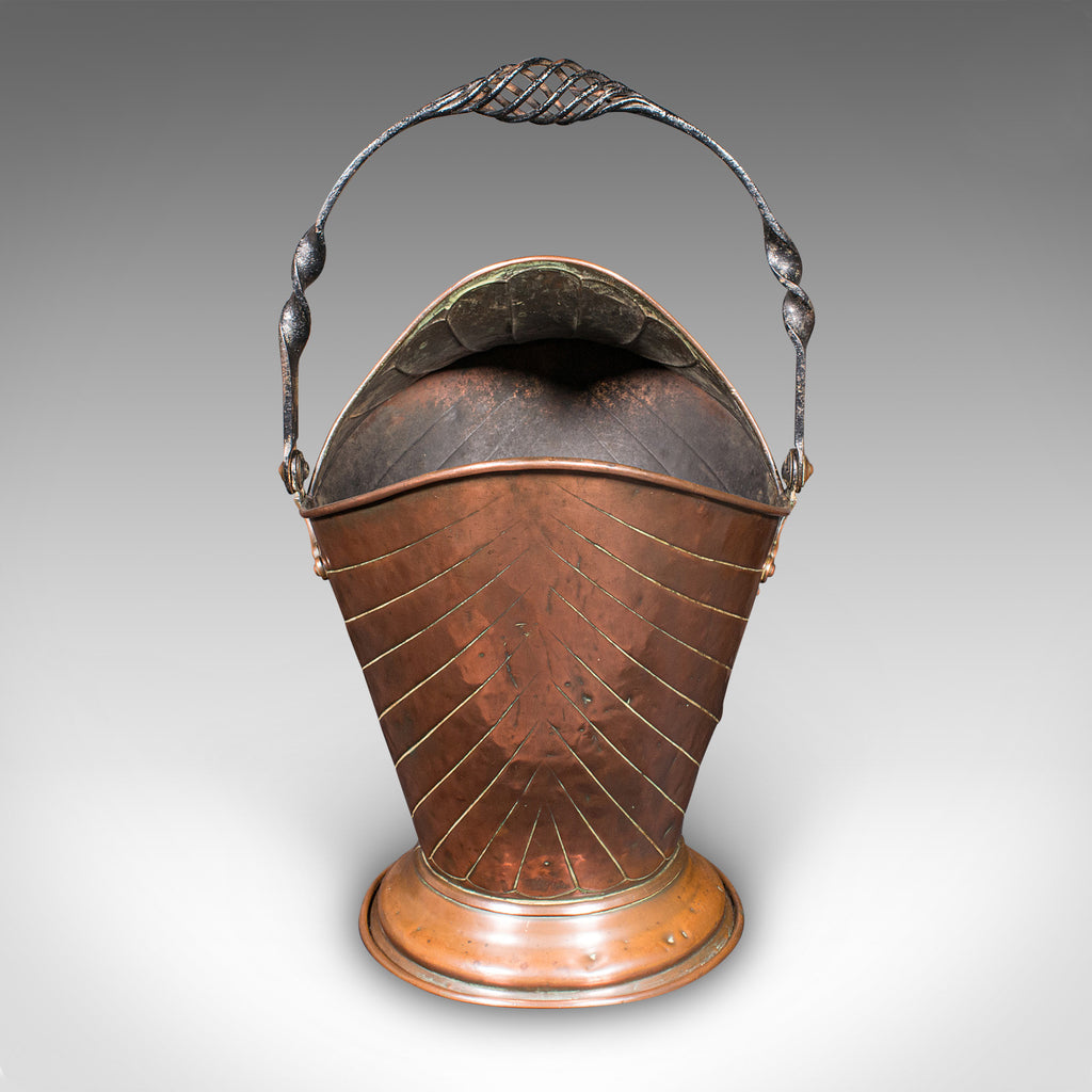 Antique Coal Scuttle, English, Copper, Fireside Basket, Art Nouveau, Victorian