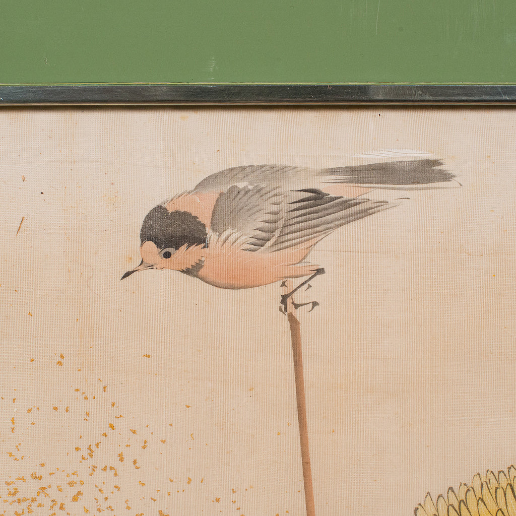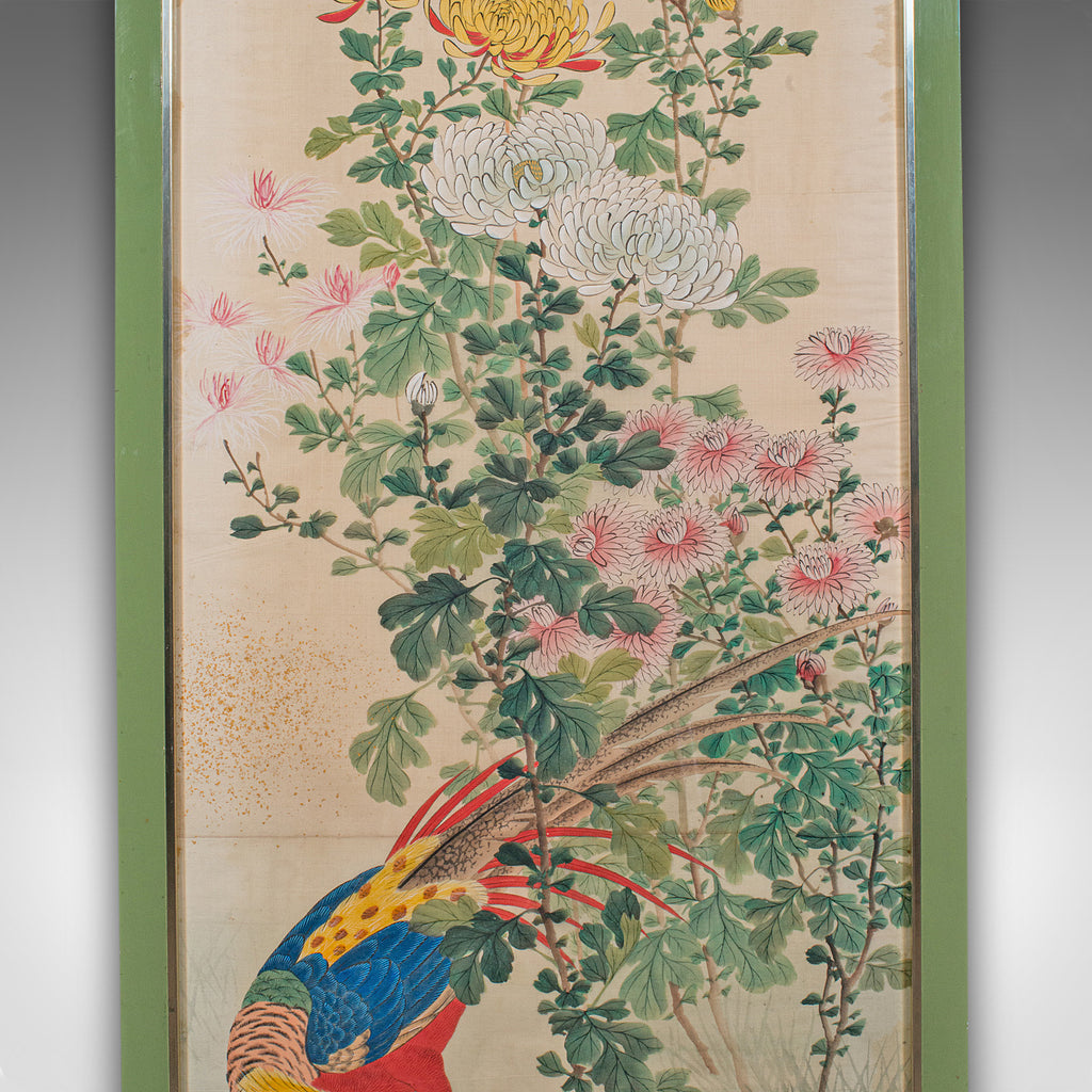 This is a tall vintage wall panel. An Oriental, watercolour on silk depicting a golden pheasant and foliate scene, dating to the Art Deco period, circa 1930. A striking decorative artwork, beautifully framed and of impressive proportion.