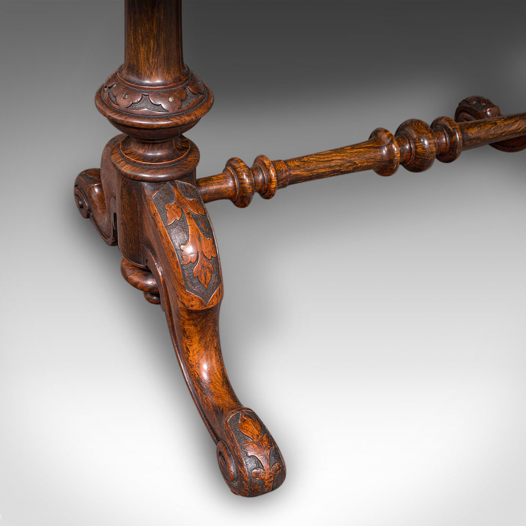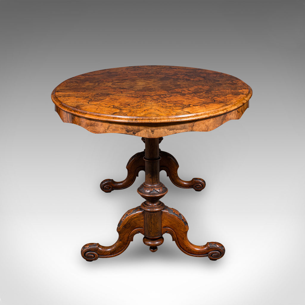 This is a superb antique display or centre table, distinguished by its beautiful burr walnut top and ornate craftsmanship. Solid joints and construction, delivered ready for the home.