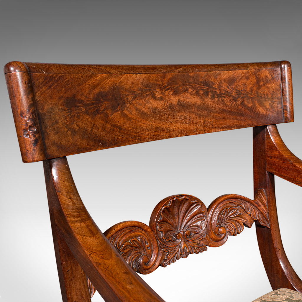 This is a fine antique elbow chair. An English, mahogany armchair or drawing room seat, dating to the Regency period, circa 1820. Of wonderfully distinctive form, it displays superb craftsmanship, graceful lines, and elegant Regency taste.