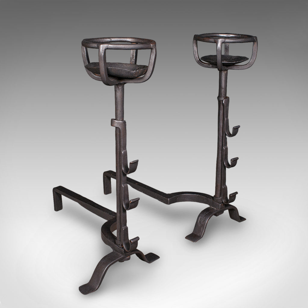 This is a fascinating antique fireplace set, with superb andirons that host generous warming bowls and suspend the appealing basket within the hearth. Delivered ready for the home.