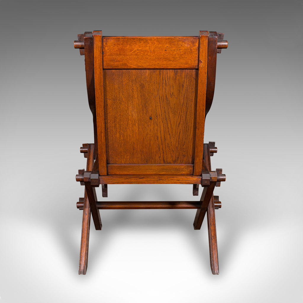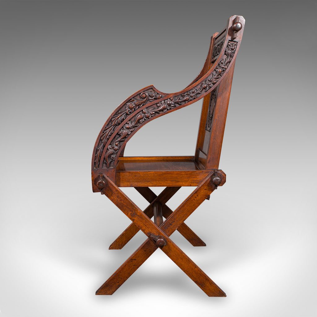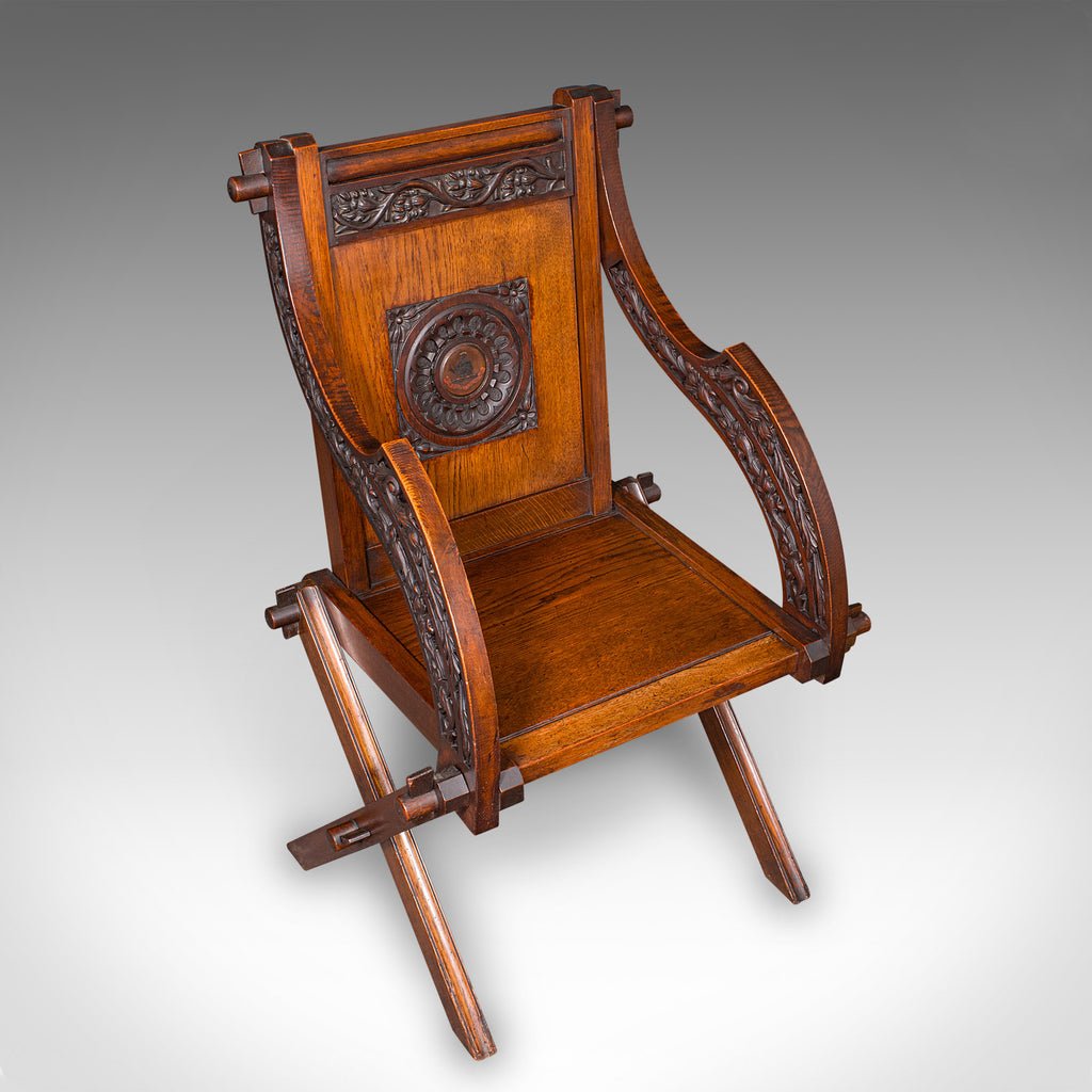 This is an antique Glastonbury chair. An English, oak armchair in Gothic Revival taste, dating to the Victorian period, circa 1880. A superb example of the traditional Glastonbury form, this distinguished chair exhibits the bold lines, medieval inspiration, and craftsmanship typical of the late 19th century Gothic Revival movement. Wonderfully constructed and full of character, it makes a commanding statement piece for a study, library, or hall.