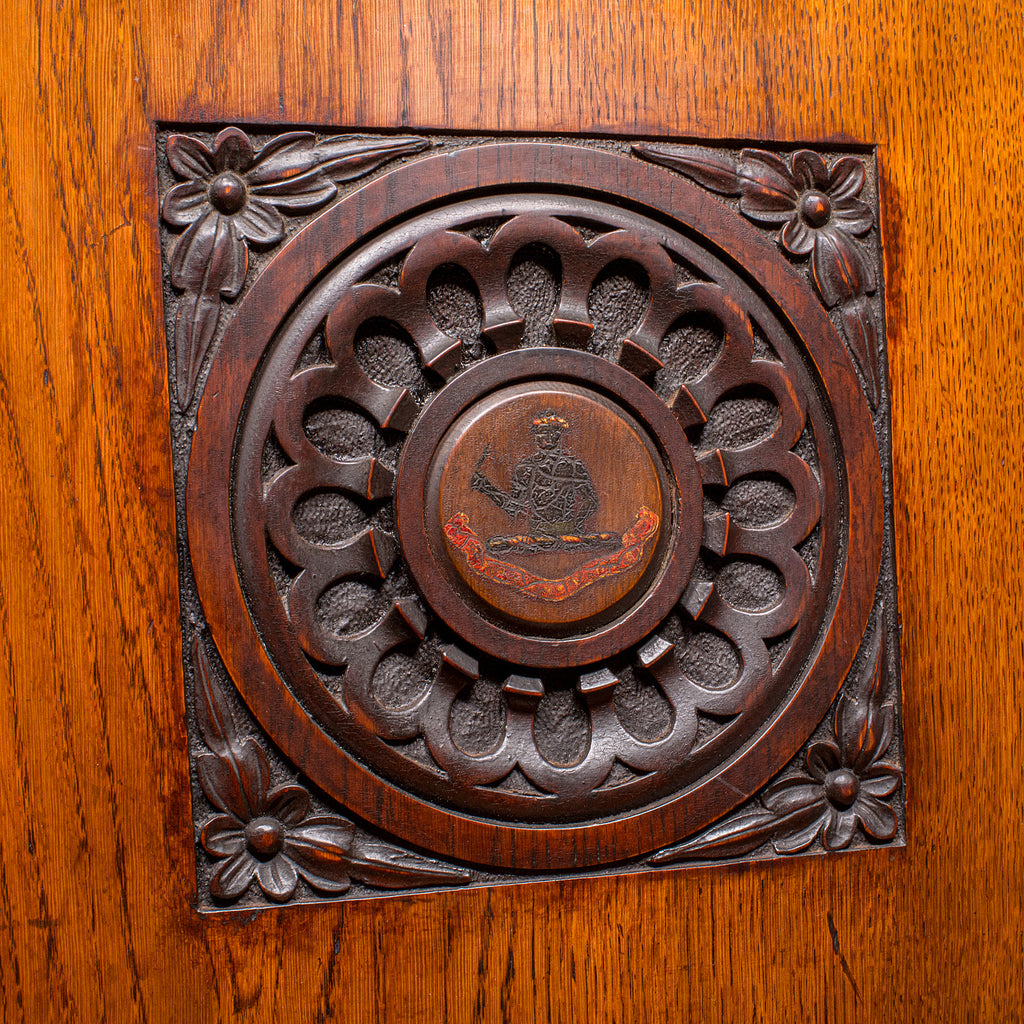 - Square frieze to the back rest hosts a flowerhead carved medallion with heraldic portrait to the centre