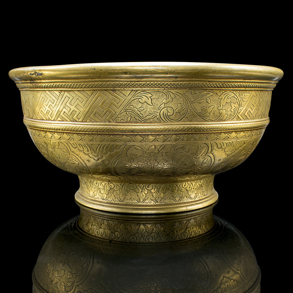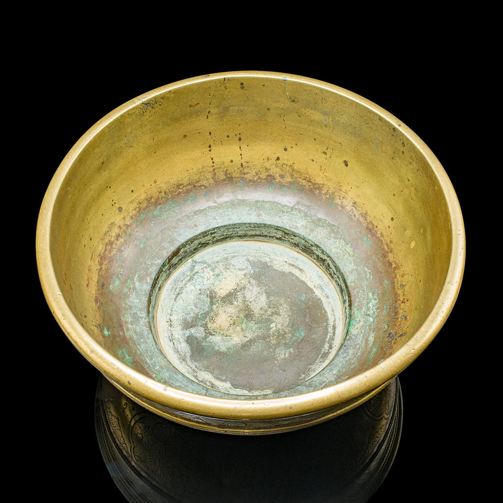 This is an antique planter bowl. An Oriental, brass jardiniere dish, dating to the early Victorian period, circa 1850. Beautifully decorated and of generous size, this jardiniere makes a striking addition to an interior or conservatory.