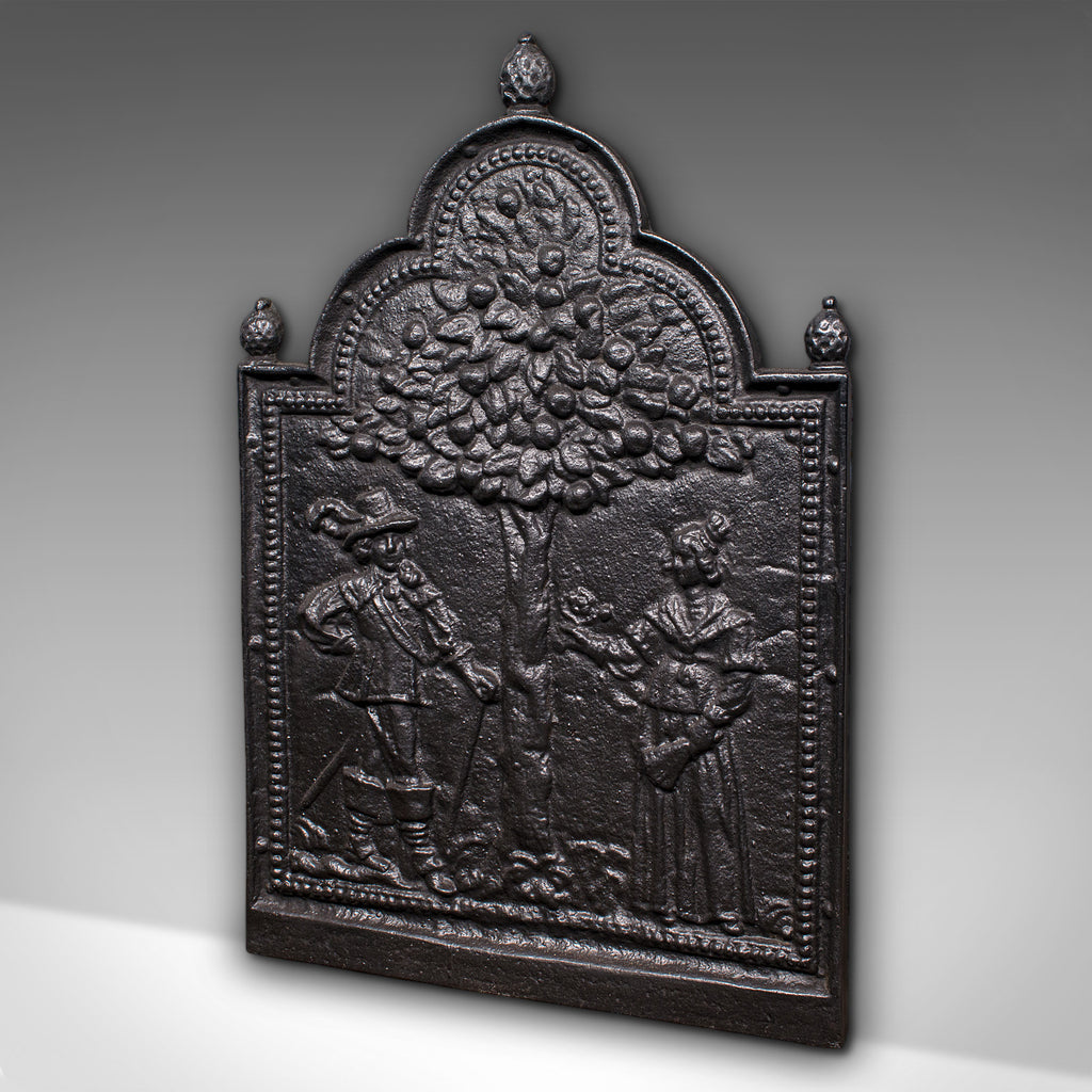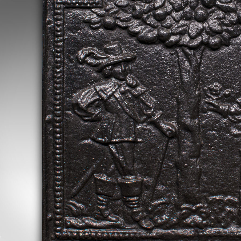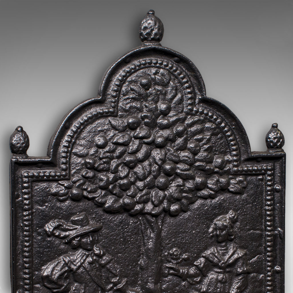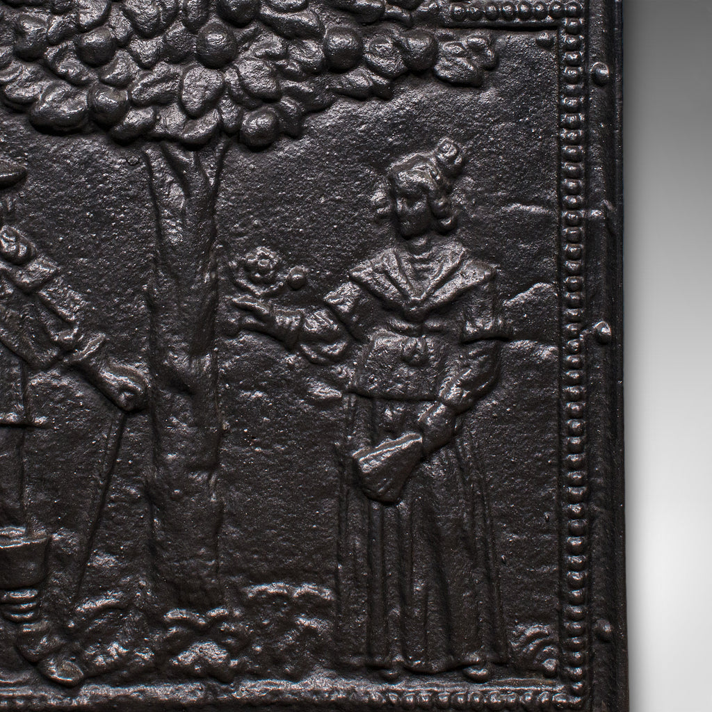 This is an antique decorative fire back. An English, cast iron figural fireplace reflector, dating to the late Victorian period, circa 1900.