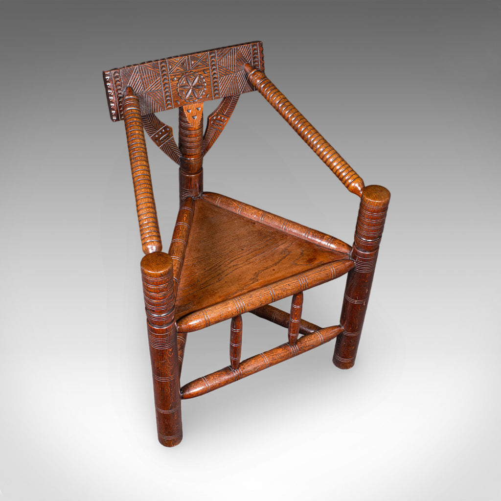 This is an antique turner's armchair. An English, oak Old Saxon elbow seat, dating to the late Victorian period, circa 1890.