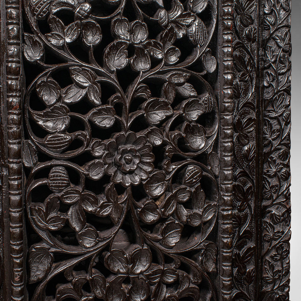 This is an exceptional antique veranda gin cabinet. A Ceylonese, carved teak corner cupboard, dating to the late Victorian period, circa 1880. Exquisitely detailed and rich in craftsmanship, this profusely carved piece exudes colonial elegance and exotic charm, making it ideal for the presentation of fine refreshments or display of cherished glassware.