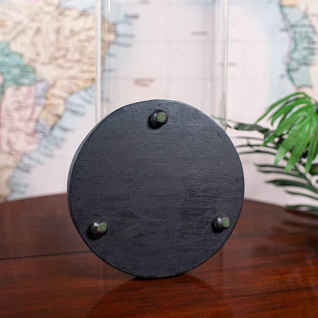 - Wide circular base with gently rolled edge and a trio of bun feet