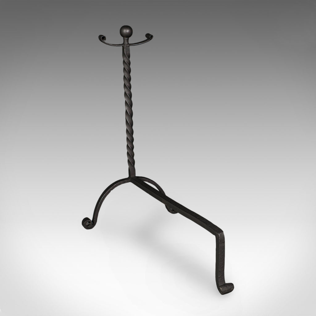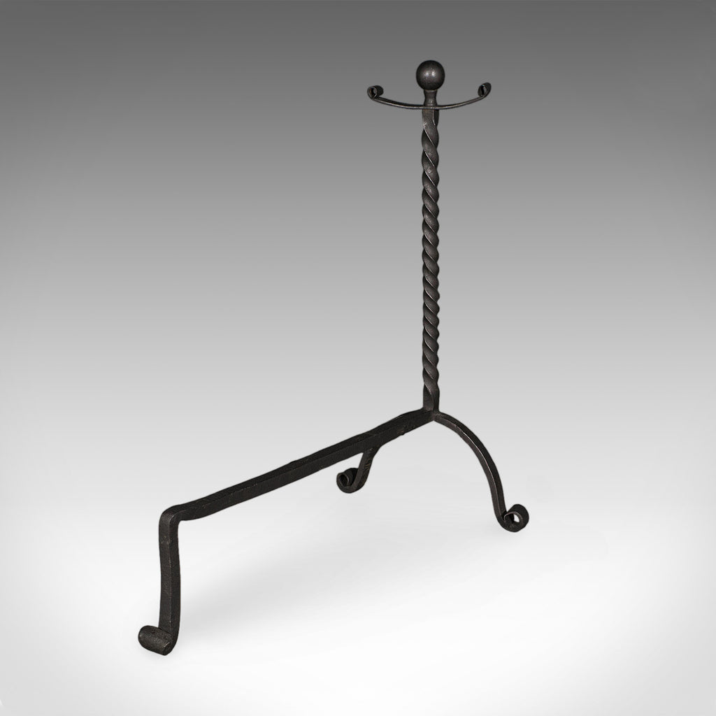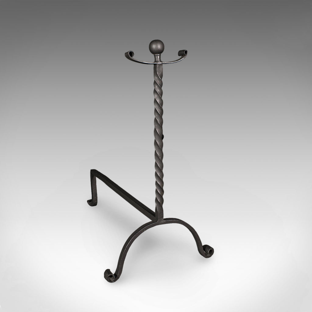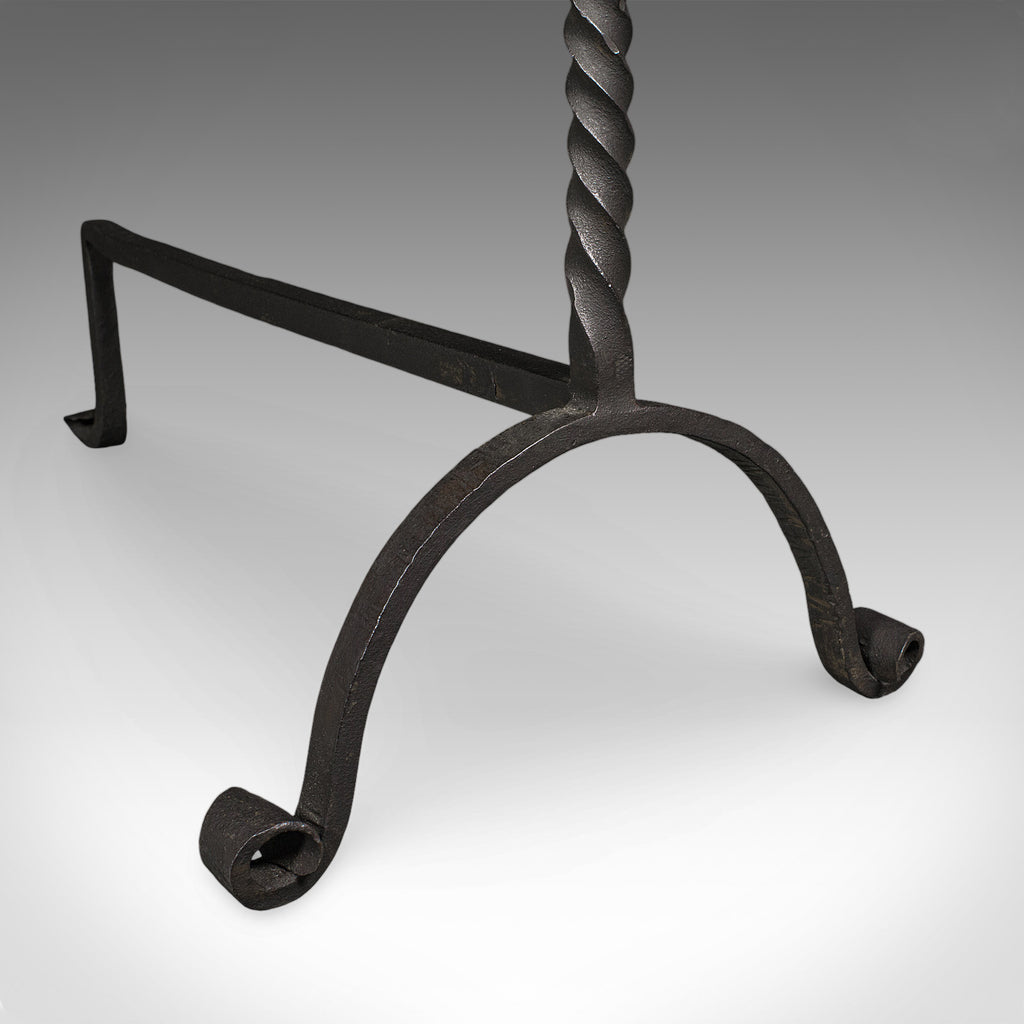 This is a large pair of antique fireplace andirons. An English, wrought iron fire dog, dating to the Victorian period, circa 1860.