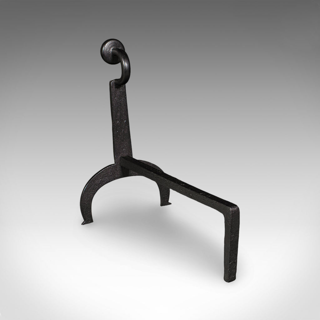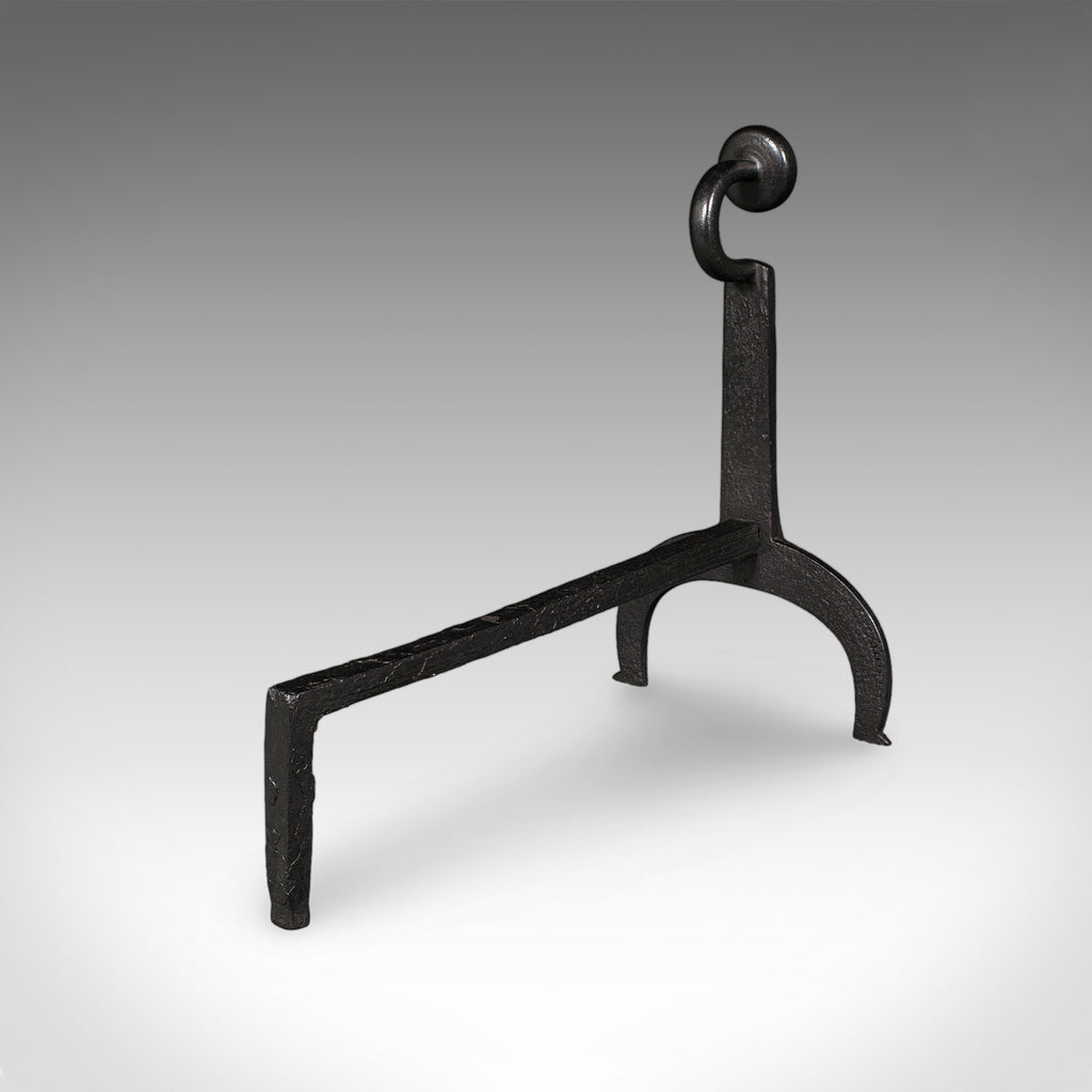 This is a pair of antique fire dogs. An English, wrought iron fireside andiron, dating to the Victorian period, circa 1850.