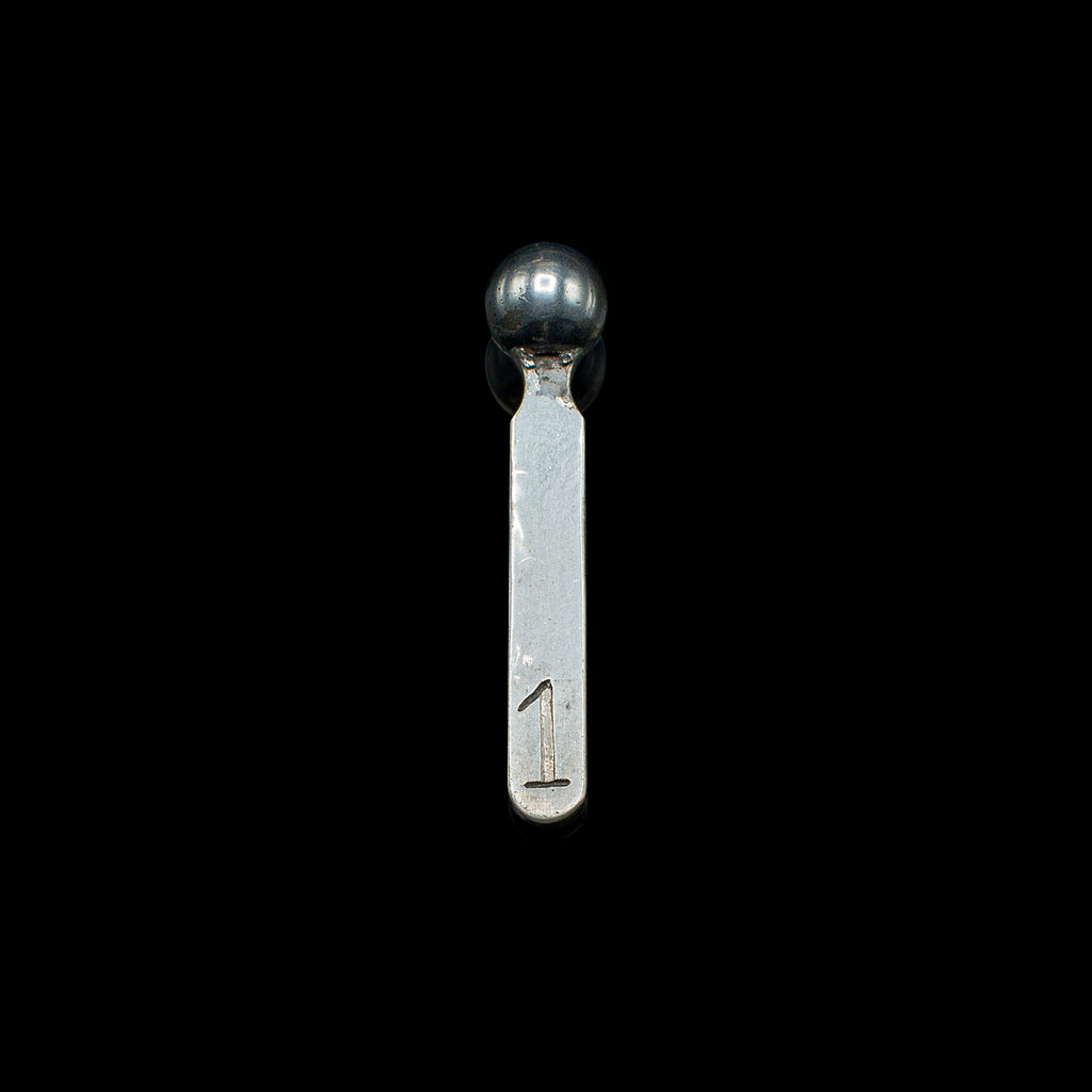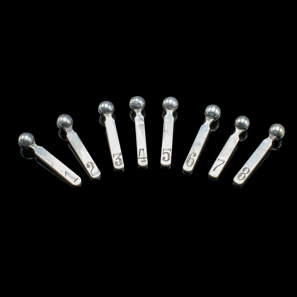- Lid opens to reveal eight numbered pegs, each topped with a small finial