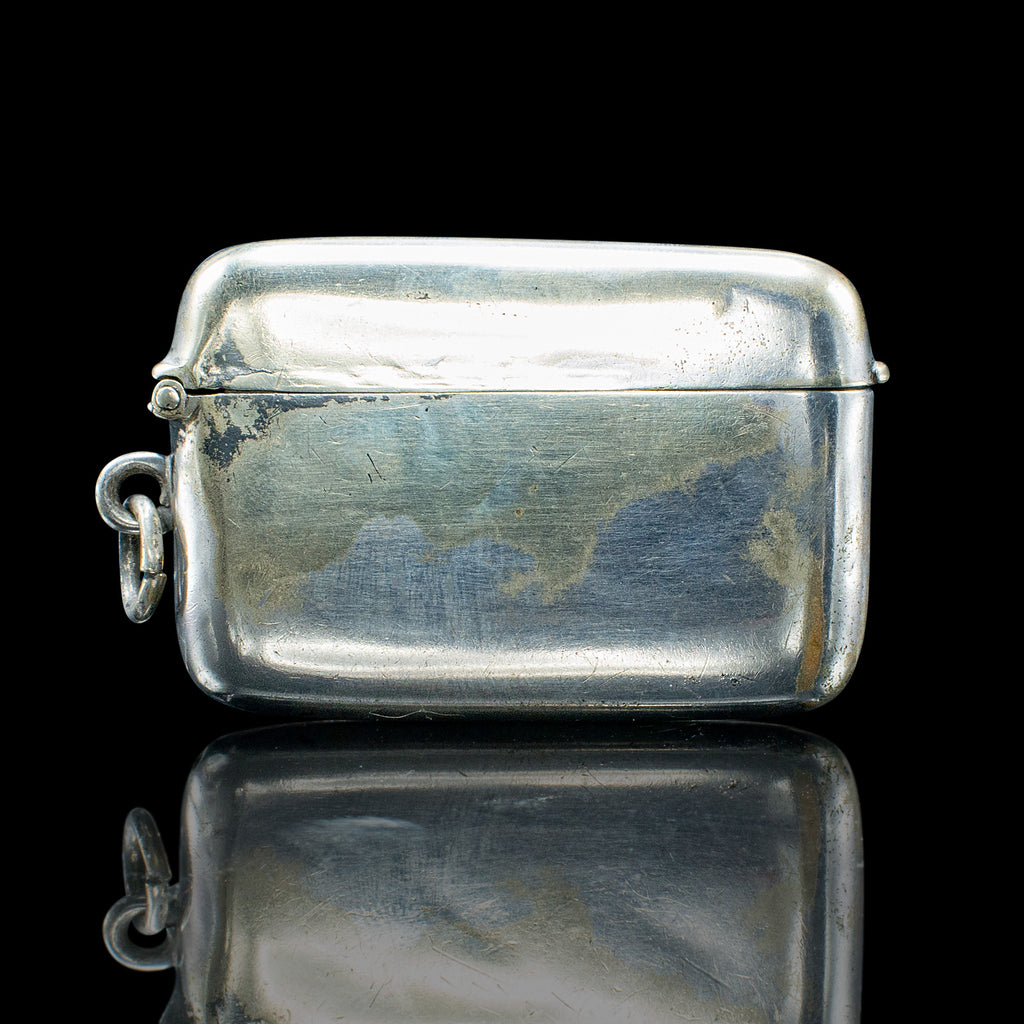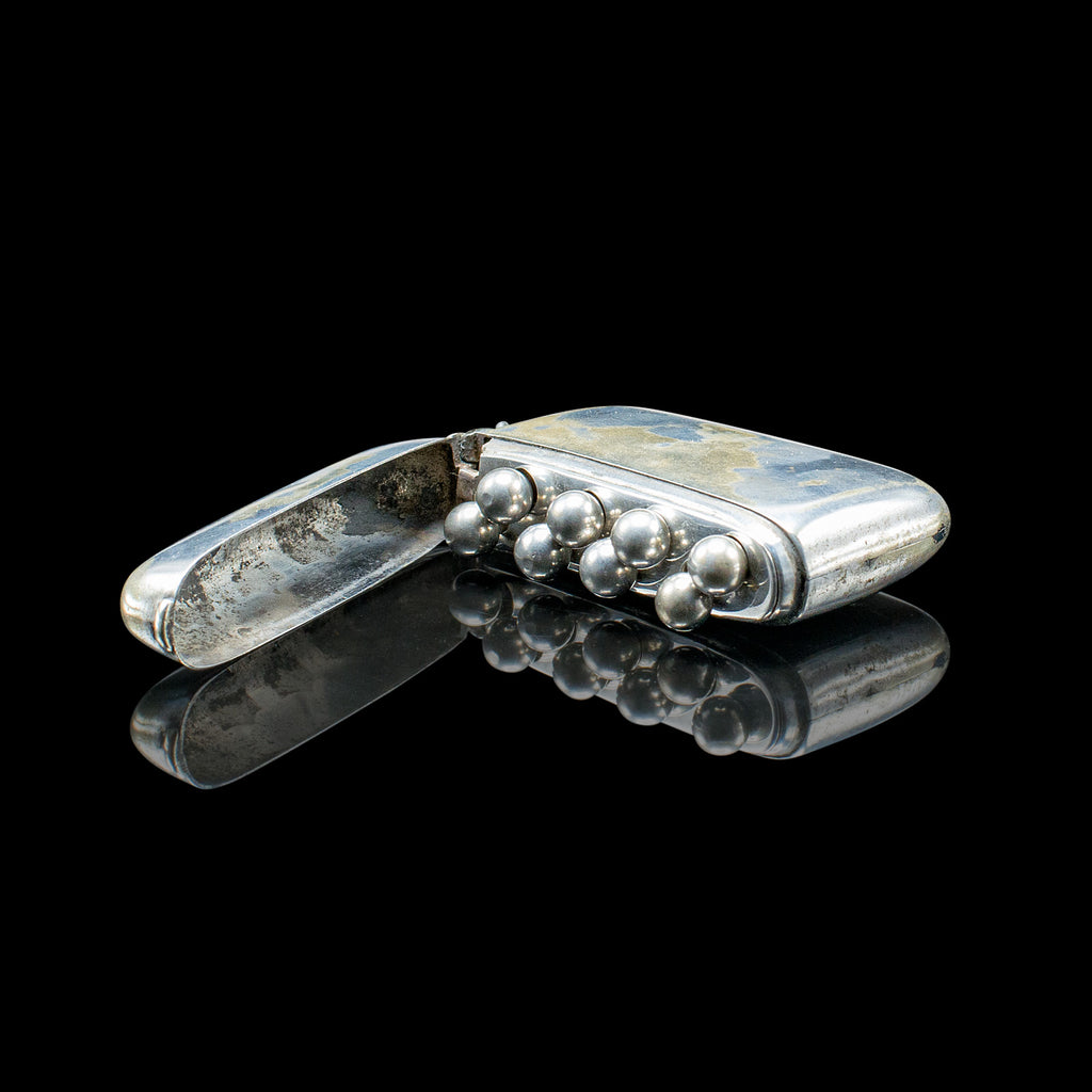 This is a small antique shooting peg case. An English, silver plated butt marker box, dating to the late Victorian period, circa 1900. A charming and highly collectible piece of shooting memorabilia, pocket-sized and full of character.