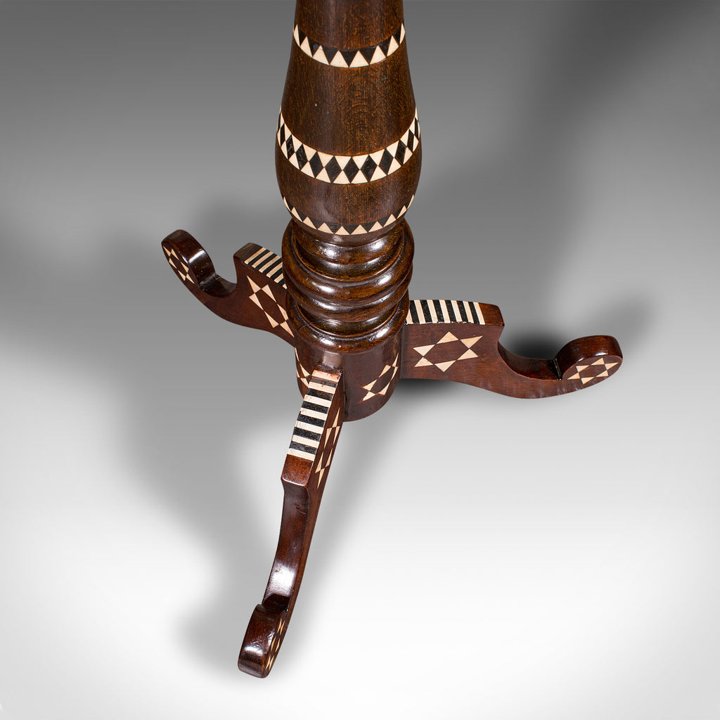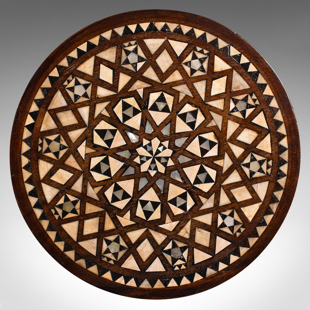 This is a small vintage hookah table. A Middle Eastern, mahogany side table inlaid with bone and Mother of Pearl in the Moorish taste, dating to the mid 20th century, circa 1950.