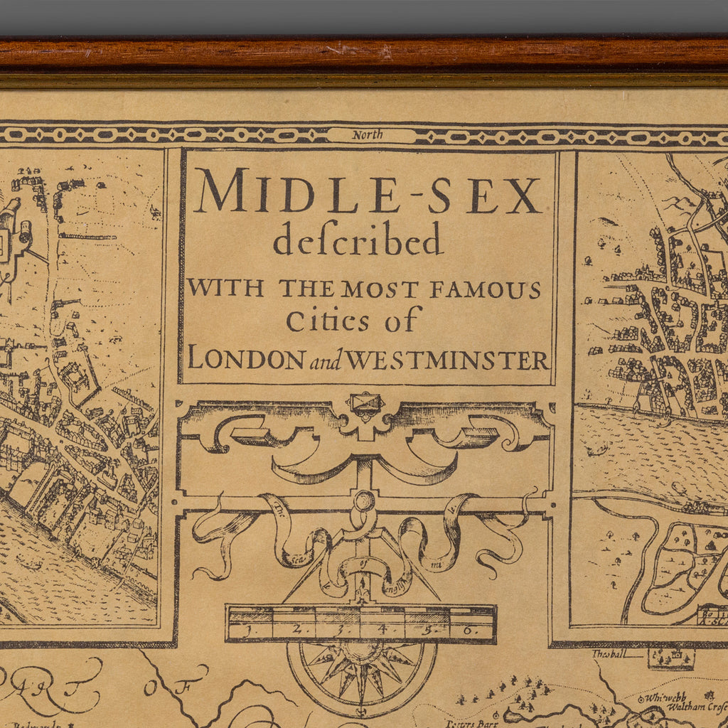 This is a vintage county map of Middlesex. An English, framed reproduction of the 16th century original by John Norden, dating to the late 20th century, circa 1980. A fascinating recreation of the historic 1595 engraving, capturing the Elizabethan-era geography of Middlesex and London in fine detail.