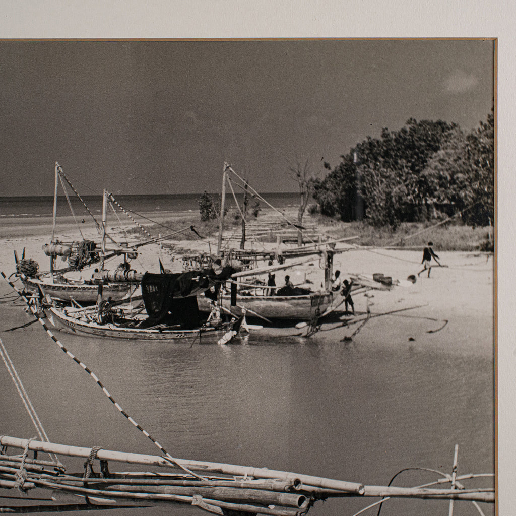 This is a fine vintage monochrome photograph of fishing boats in East Java, Indonesia, showing attractive tonality and appealing composition. Delivered ready to display.