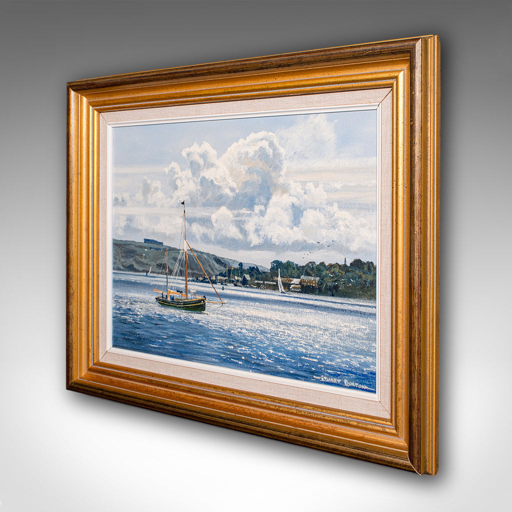 This is a vintage Plymouth Sound painting. An English, framed oil on canvas nautical picture by Stuart Bolton, dating to the late 20th century, circa 1970. A delightful seascape with appealing colour and confident technique.