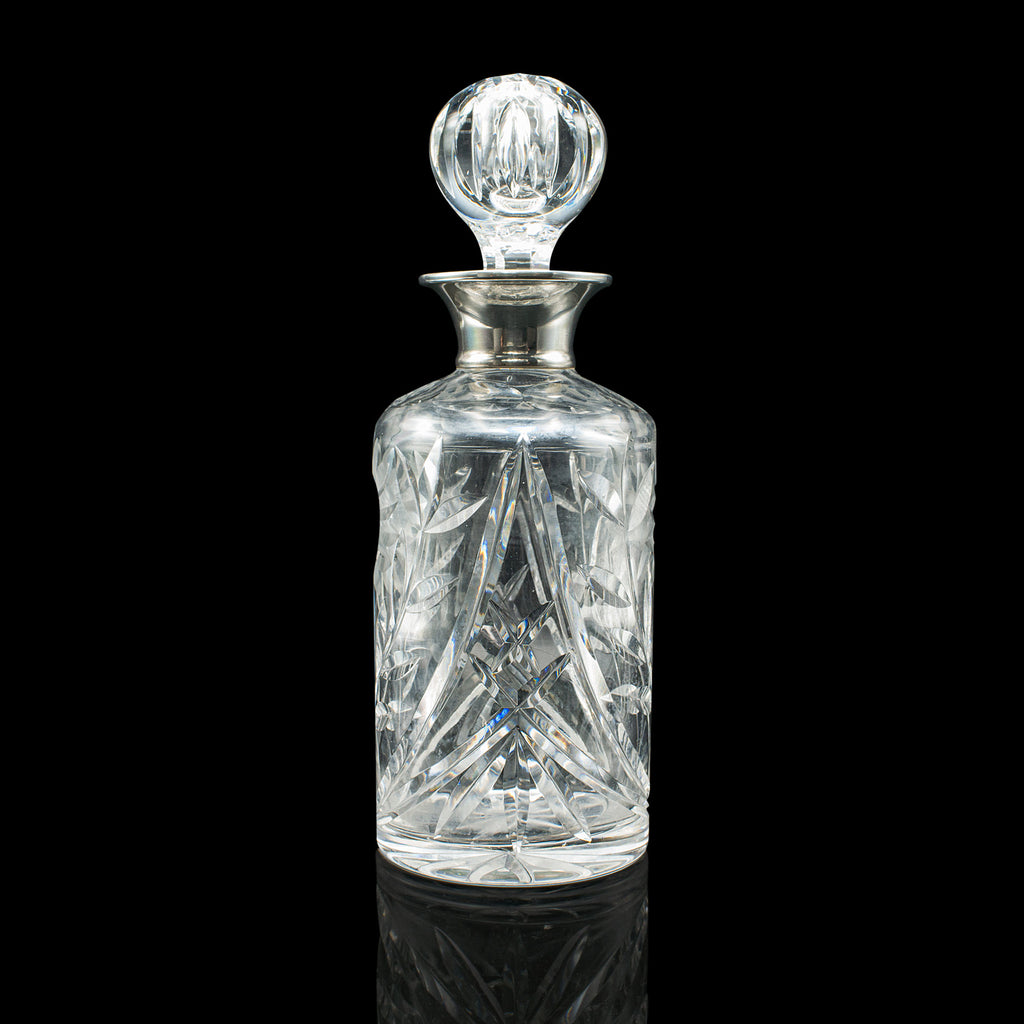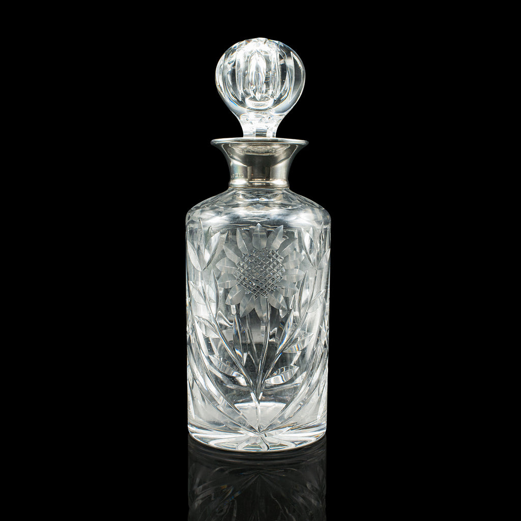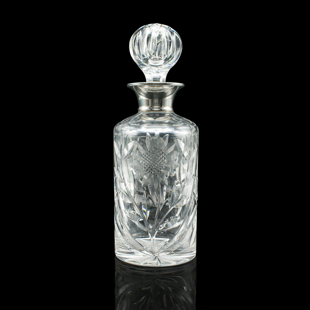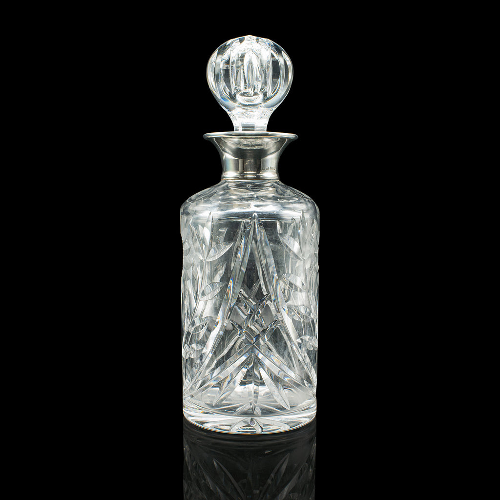 This is a vintage Scotch decanter. An English, cut glass whiskey vessel with sterling silver collar, dating to the mid 20th century, hallmarked in 1965. A superb example of refined mid-century barware, blending fine materials and craftsmanship with timeless elegance.