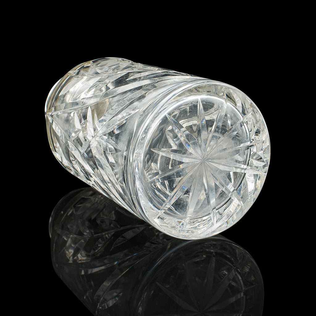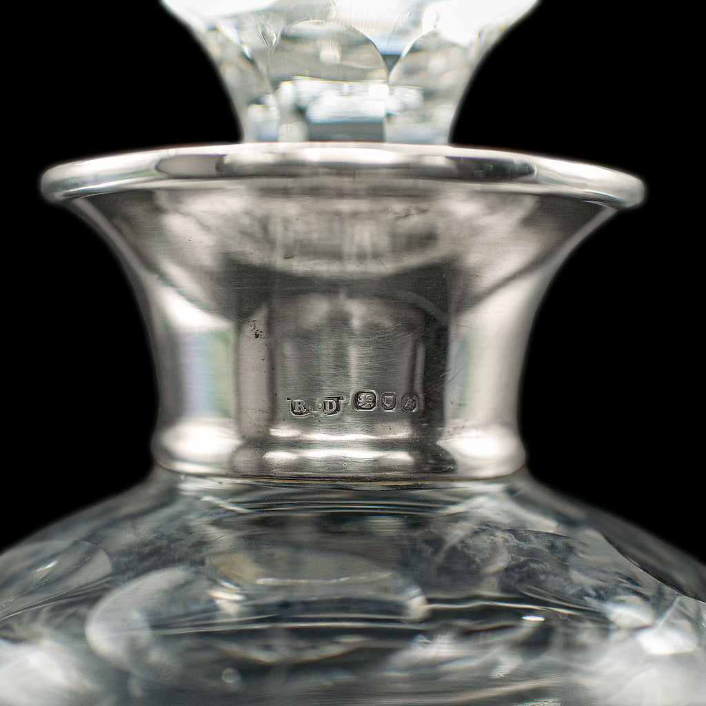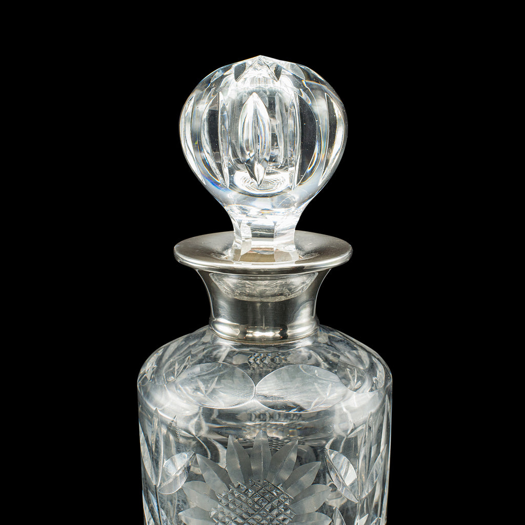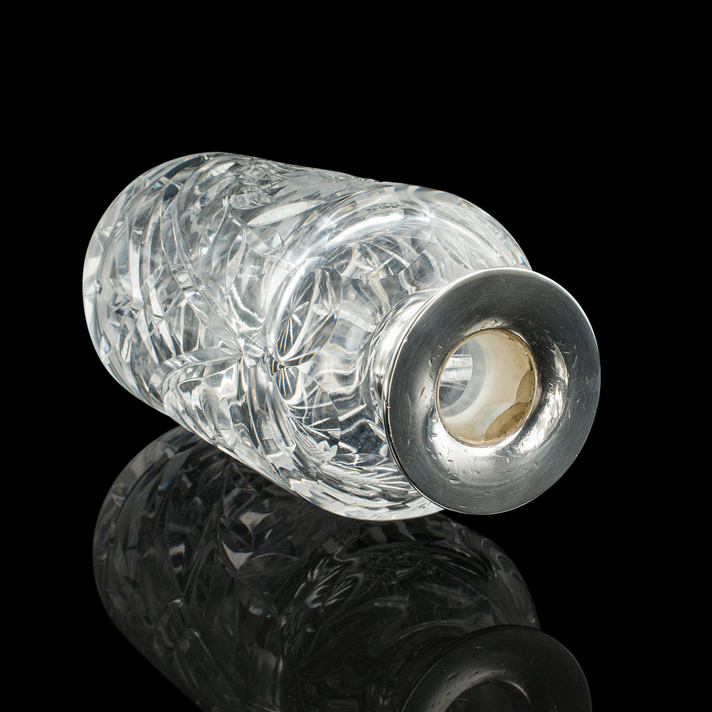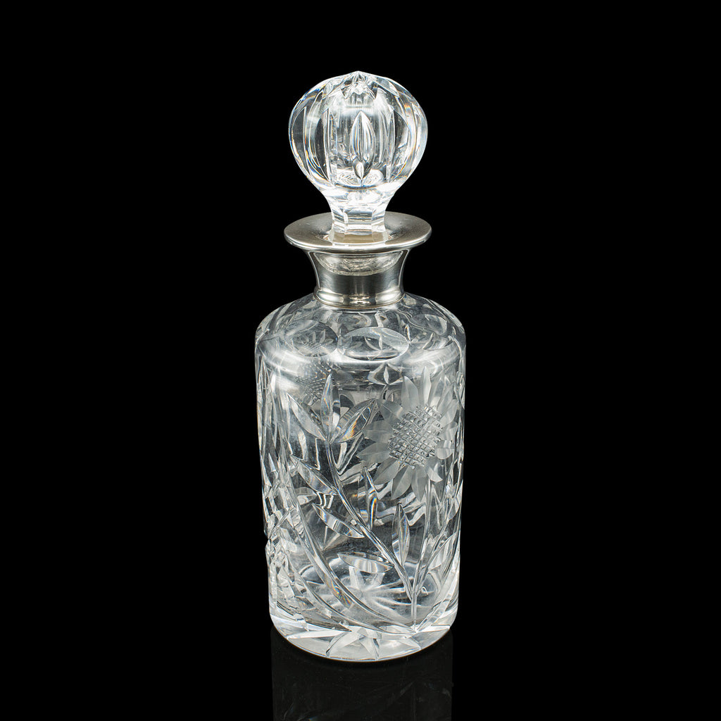 This is a vintage Scotch decanter. An English, cut glass whiskey vessel with sterling silver collar, dating to the mid 20th century, hallmarked in 1965. A superb example of refined mid-century barware, blending fine materials and craftsmanship with timeless elegance.